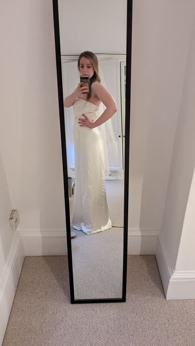 Beautiful silk bandeau wedding dress RRP £400 never worn as ended up wearing a jumpsuit! Reformation US size 4. Fits UK 8 and bandeau has stretch at back.