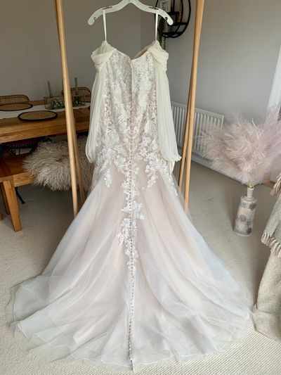 David’s Bridal Fall 2019 Collection. Never Worn. Ivory/Champagne figure hugging mermaid wedding gown adorned with ornate floral appliqué. Illusion sheer bodice, allover lace and tulle. Custom added off shoulder sheer sleeves with appliqué wrist and faux button back enhance this romantic look.