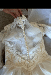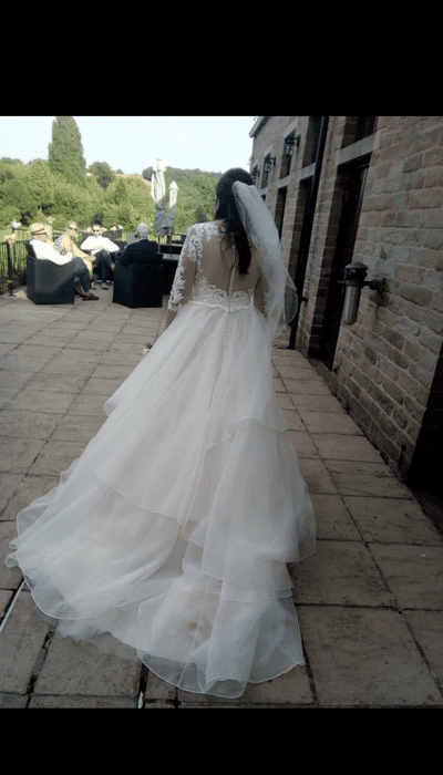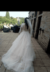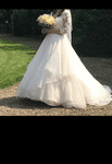 The product is a beautiful white/ivory wedding dress in size 12, featuring intricate embroidery, lace, beading, sequins, and crystal/diamante detailing. The dress has a long-sleeved style and is made of chiffon and lace, giving it a princess-like look. This dress exudes elegance and sophistication.