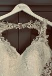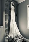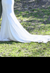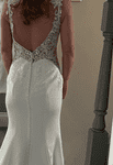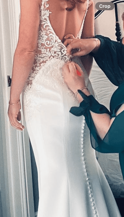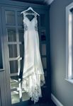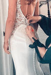 Stunning wedding dress with sculpting hip cut outs, beautiful lace key hole back and sheath illusion train. A head-turning design with beautiful fabric. Size 10, standard fit. Professional alterations to include mesh ribbon on underside of straps; fit length of a 5ft 5 bride wearing 2-inch heels.