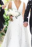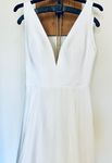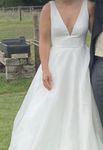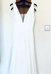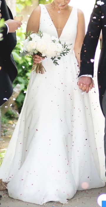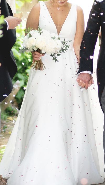 • Style: Classic V-neck, fitted bodice and waist, flowing into a full silk skirt • Size: Tailored to a UK 10 (I’m a 32B/C bust), but easily alterable • Condition: Very loved and professionally dry-cleaned. No visible marks except for some minor signs of wear on the underside of the skirt