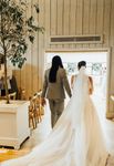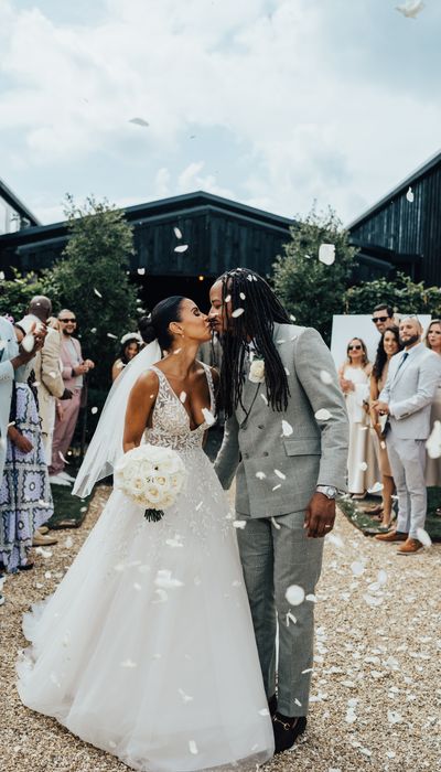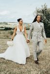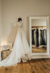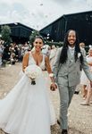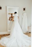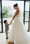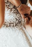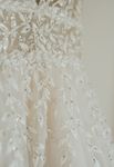 Plunge neckline with removable sewn-in cup support. A delicately embellished bridal gown. Perfect for a summer or winter wedding. The dress was comfortable & not heavy. Bride pictured is 5ft 2 wearing Jimmy Choo 4.5 inch platforms so the dress was fitted to the brides height with heels on.