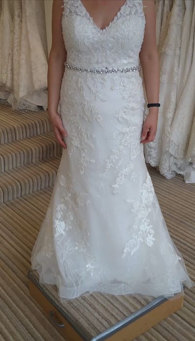 A-line Ella Rosa wedding dress with lace and diamonte detail. Comes with an optional waist belt Size 14 Still in original bag with tags
