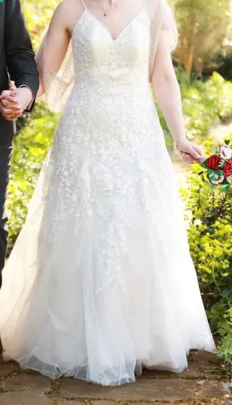 There is a very subtle nude pink/blush colour in the under layer, with white tulle top layers with a floral lace pattern. Bought as a UK size 12 but altered to fit me (UK 10, 165cm/5ft5in). Further measurements can be provided on request. Selling with the hanger, dress cover and carry case.