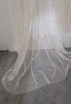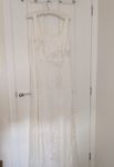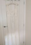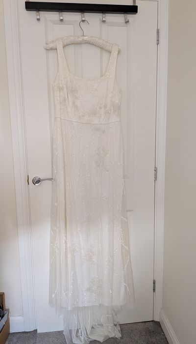 Beautiful Monsoon white beaded dress, slight stretch. Empire style. Train can be pinned under to be floor length or unbuttons to trail slightly. Sequins, pearls and beads make a floral design. Worn once to try on. Tags still on.