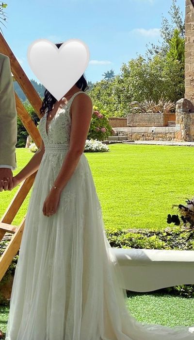 Lillian West romantic wedding dress Size: 8 / 10 Original price: 1750.00 pounds Neckline: V plunge Silhouette: A-line Open back Waistline: natural Trend: boho Fabric: lace and tool In perfect condition and it has been dry cleaned Collection from Haywards Heath, UK