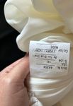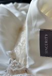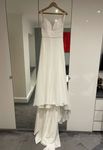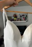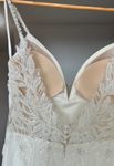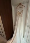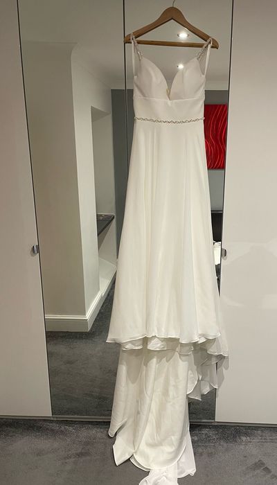 The most gorgeous A-line bridal gown, with a bikini neckline and a figure flattering inset waistband, glammed up by a glitzy belt. Beads and sequins embellish the open v-back. Chapel length train to the floppy chiffon skirt. Never worn but altered to 5’7 height and added glitz to the straps.