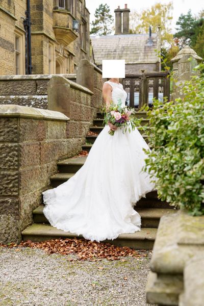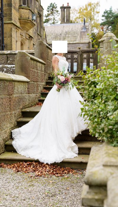 Gorgeous lace design with a beaded back that zips Sheer panel at the front with laced cap sleeves Flattering flare gown that highlights waist and then flows into a full skirt (images show the layers) Minor alterations to the length Very minor dirt stains on the very bottom of the gown, hardly notice