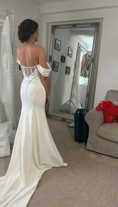Worn once on my wedding day 01/09/2023, bought for £1300. It's been dry cleaned and remained boxed, some mild staining to the bottom of the front sides but the train is immaculate, please see photographs. The dress was a size 12 but has been taken in to fit me, so it's more like a large 10