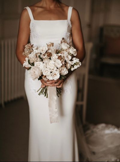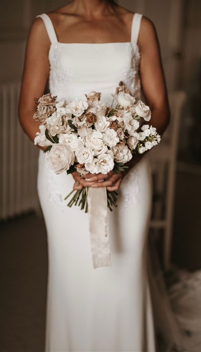 Blue By Enzoani Bridal Gown - Sinclair - Size 10-12 Straps altered to a wider strap than the original Dry cleaned and ready to post No marks SINCLAIR is a crepe sheath gown that falls gracefully into an exquisite beaded floral embroidered lace and tulle train with a dramatic scalloped hem.