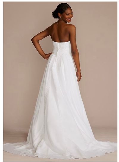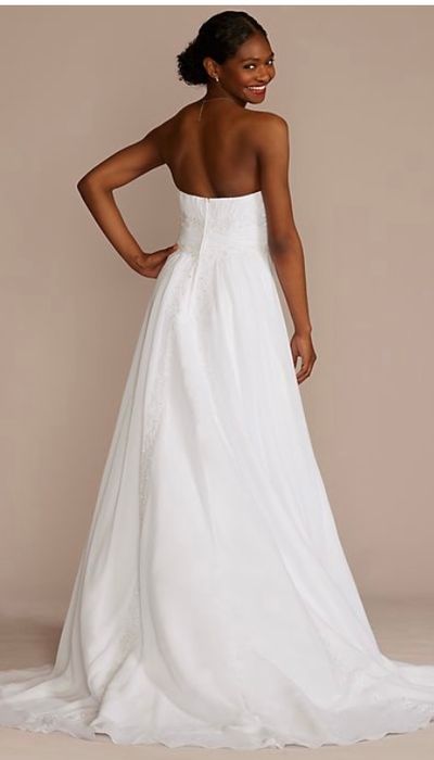 This empire-waist strapless wedding gown is beautifully designed with exquisite hand-beaded lace. The fitted bodice flows into a soft chiffon skirt, the back of which is topped with a beaded lace detail from waist to hem. This beautiful gown is a US Size 0 but will fit anyone between a UK Size 4-8