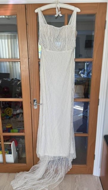 The dress has been taken in at the hips and under bust - the length hasn't been altered Measurement for under bust is 30 inches, hips are 36 inches Sadly, the dress was never worn due to a surprise pregnancy before the wedding, so it is in immaculate condition! Spare sequins included with the dress.