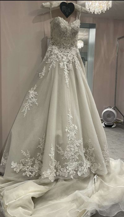 Beautiful ivory ball gown with subtle glitter and lace appliqués. Lace up corset with panel fitted so dress will fit a bride that is a size 6-10! Comes with two detachable straps. Professionally dry cleaned and has never been worn, as the wedding was cancelled. Email me for more pictures :)