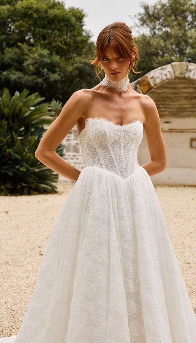 Never worn - dress size 16 but body size 14 and unaltered, selling including the cape (retails for £700 more). Delicate and feminine Chantilly lace, Full flowy skirt, Basque waistline.