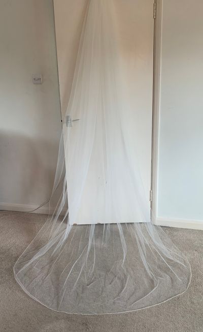 Chapel-length wedding veil, single-tier of very nice quality white net, with a single-edged trim. White net beautifully held on a comb, which slots easily into the hair and can then be secured with grips. I wore it for the ceremony only. The veil hangs well, and looks great in the wedding photos!