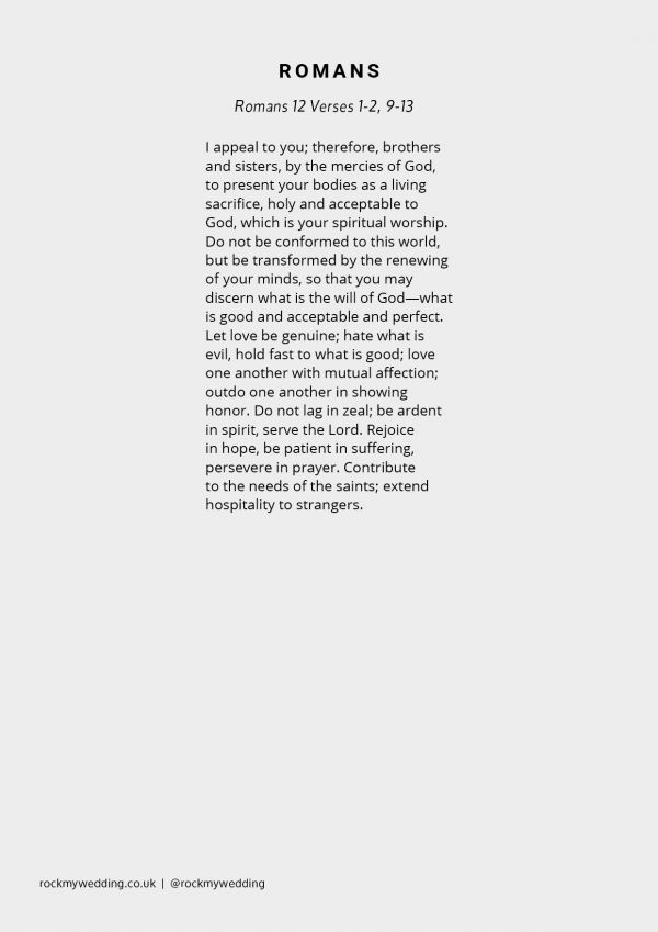 If you're looking for a copy of this Romans 12 1-2, 9-13 bible wedding reading, then we have you covered!