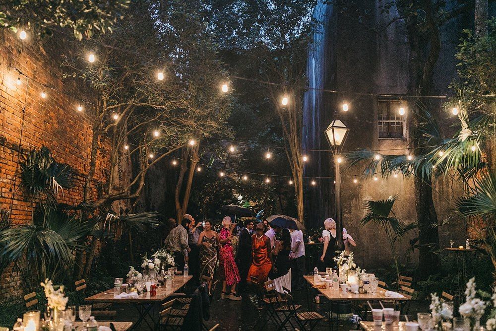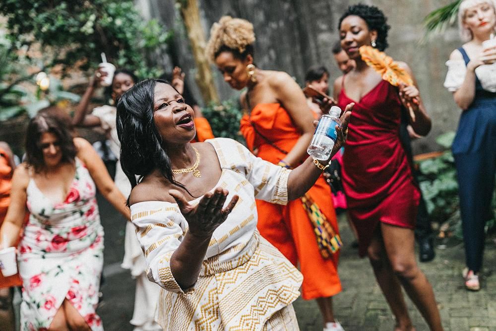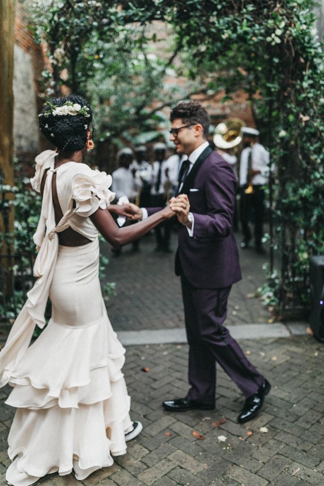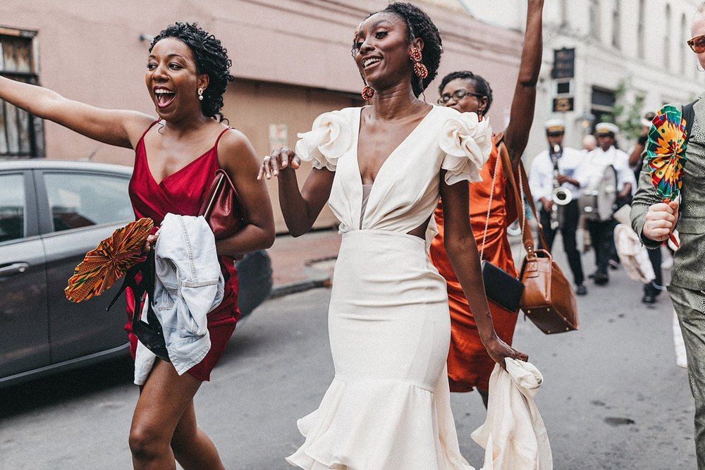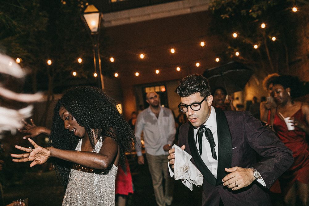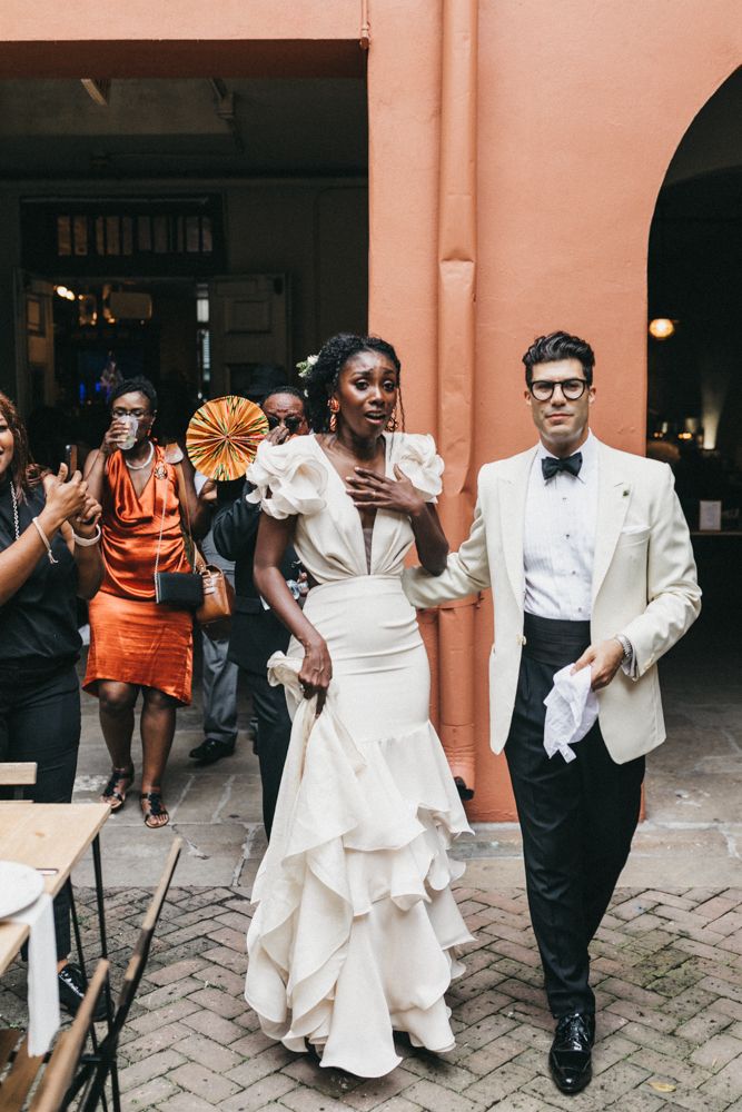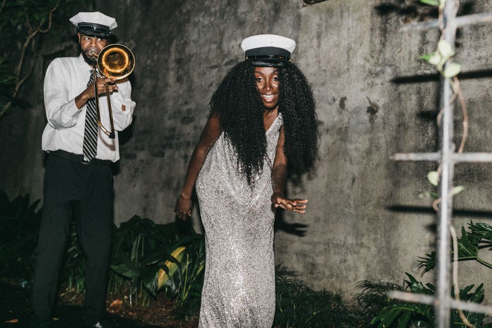 The overall vibe of the day was super chill with wild dancing! We wanted guests to feel comfortable, so there was no strict dress code. We kept the fact that there would be a Second-line procession, a secret from our guests. But I did explain that comfortable footwear was a must. I myself changed out of my wedding shoes and into my Vans trainers, as soon as possible, so I could dance for the entire night. One of my favourite parts of the day was the vow exchange, between Saul and I. It really did feel incredibly intimate. Another moment that springs to mind is our amazing after dinner rain dance. All-day we had been treated to beautiful sunshine, and then as soon as the plates and glassware were cleared away, the heavens opened up. Rather than retreating inside, everyone ran out and the brass band kept playing. We all got soaked dancing in the rain, and I’m not sure I’ve ever been happier.
