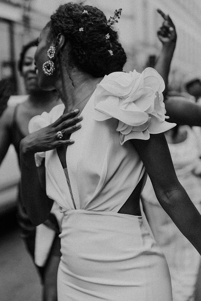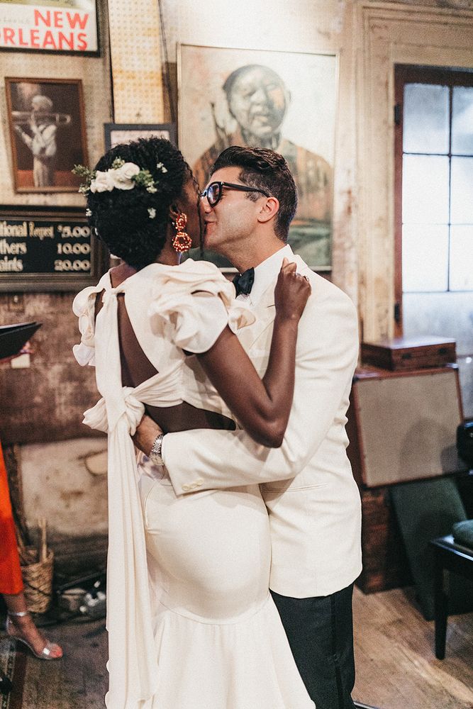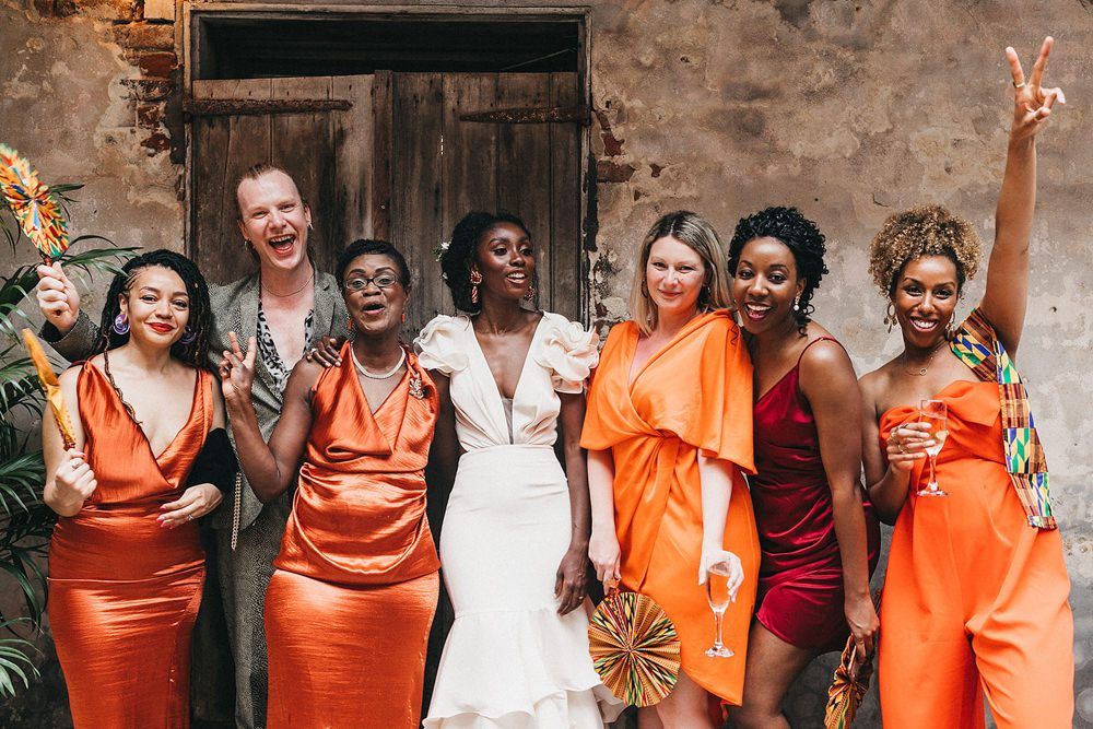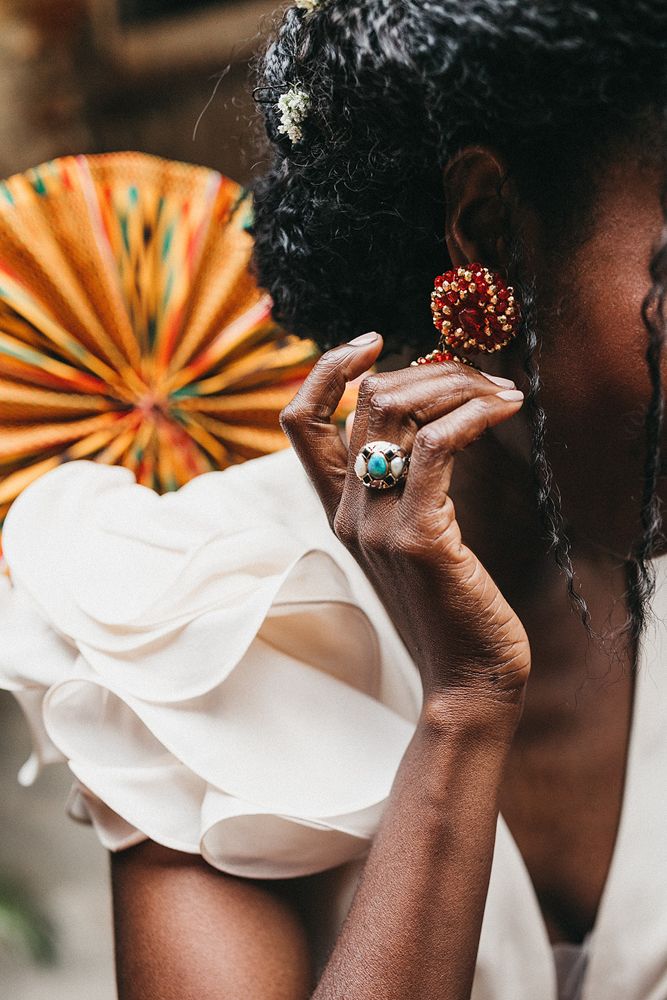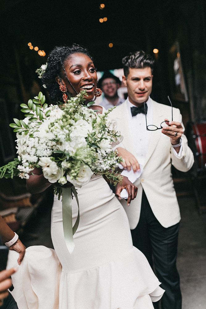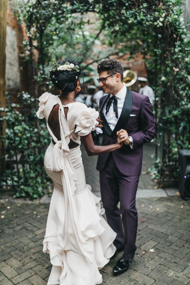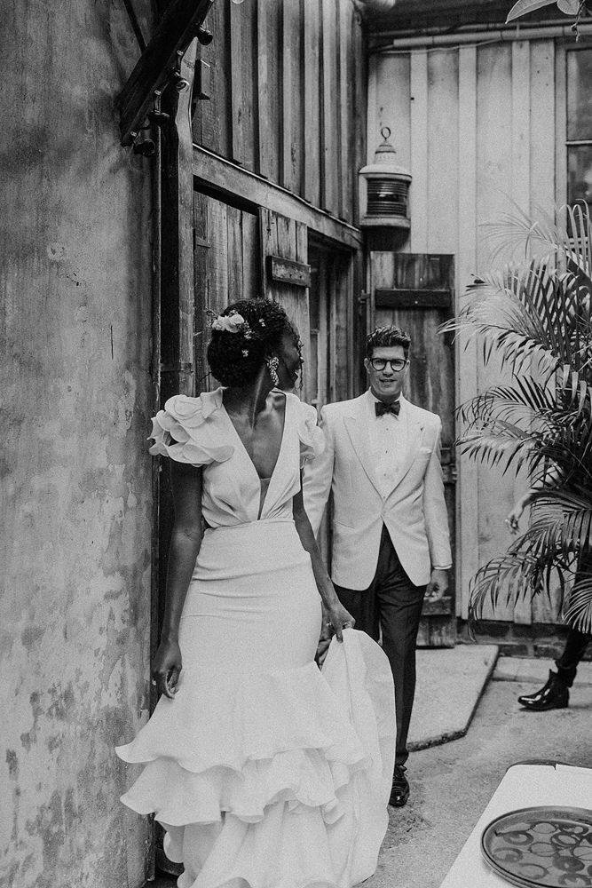 The overall vibe of the day was super chill with wild dancing! We wanted guests to feel comfortable, so there was no strict dress code. We kept the fact that there would be a Second-line procession, a secret from our guests. But I did explain that comfortable footwear was a must. I myself changed out of my wedding shoes and into my Vans trainers, as soon as possible, so I could dance for the entire night. One of my favourite parts of the day was the vow exchange, between Saul and I. It really did feel incredibly intimate. Another moment that springs to mind is our amazing after dinner rain dance. All-day we had been treated to beautiful sunshine, and then as soon as the plates and glassware were cleared away, the heavens opened up. Rather than retreating inside, everyone ran out and the brass band kept playing. We all got soaked dancing in the rain, and I’m not sure I’ve ever been happier.
