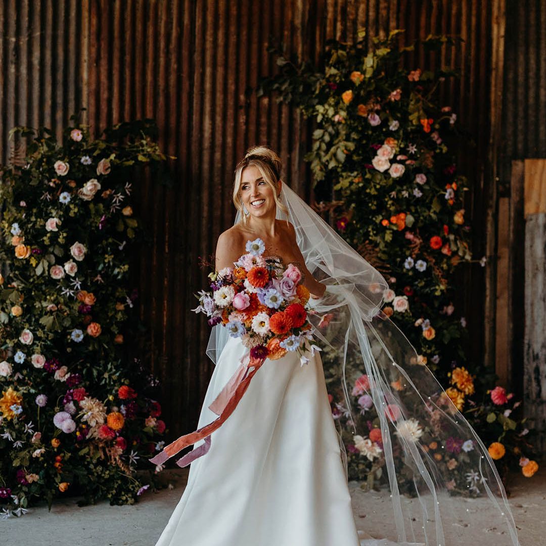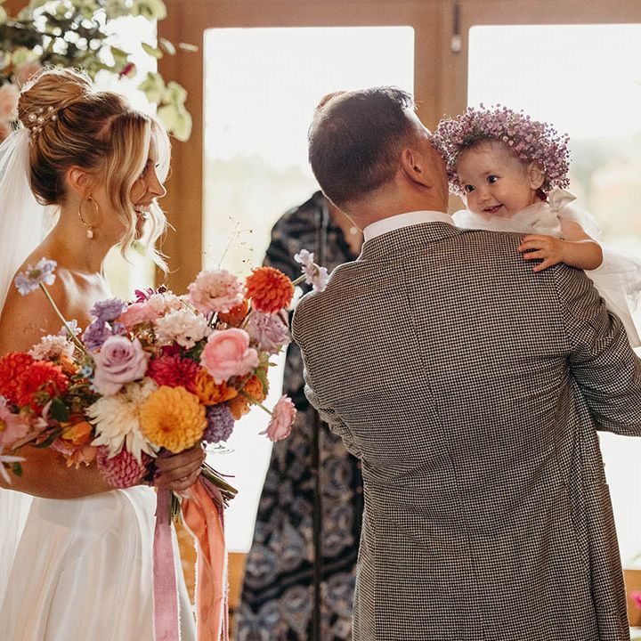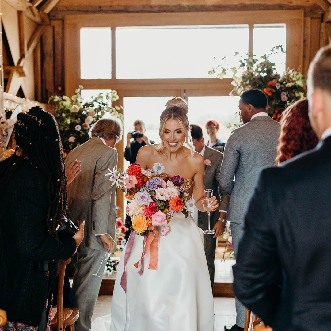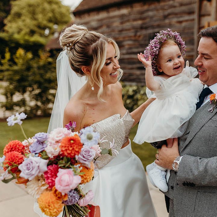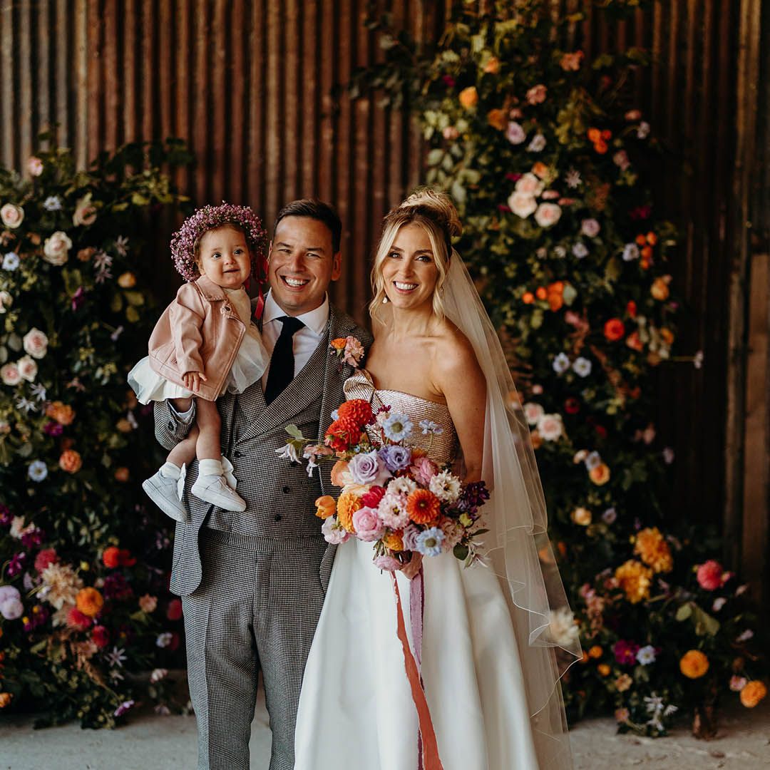 Sophie & Andi wanted their day to be a full celebration from start to finish. Styling-wise, the couple opted for wild and colourful flowers, with a rural yet contemporary aesthetic, which Silchester Farm in Hampshire provided in spades. The day started with the ultimate glam squad that made Sophie and her bridesmaids feel like a million dollars. The venue was decked out in stunning vibrant wedding flowers and those amazing flower columns! The wedding celebrant, Claire, made Sophie & Andi's wedding ceremony so personal and special and it helped to have their gorgeous little girl, in a pretty flower crown, present for the whole thing with all their other loved ones watching! Two of Sophie's friends wrote the most amazing poem about her, Andi and their daughter, which they read out at the ceremony!