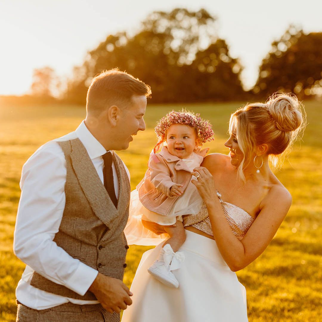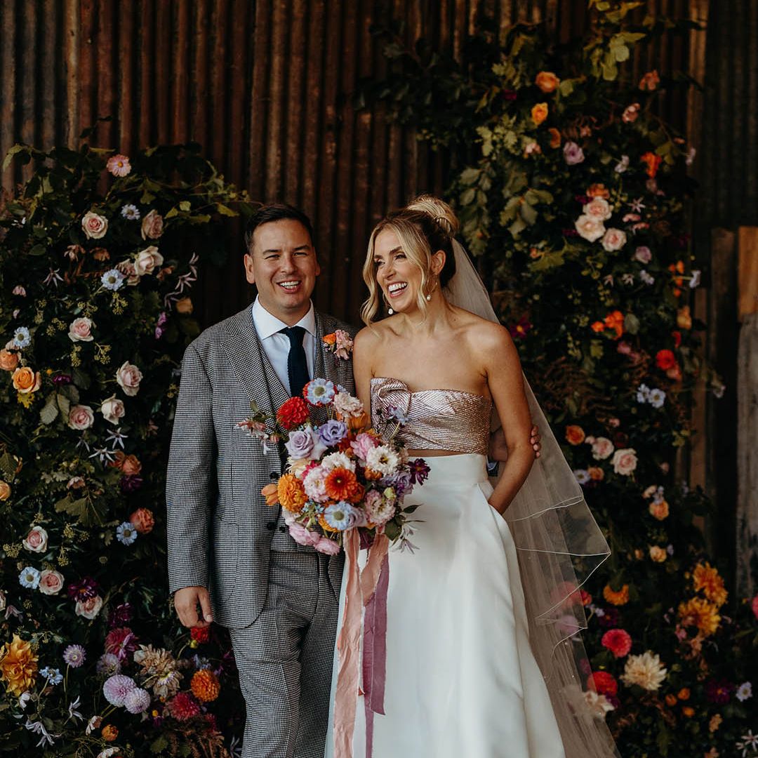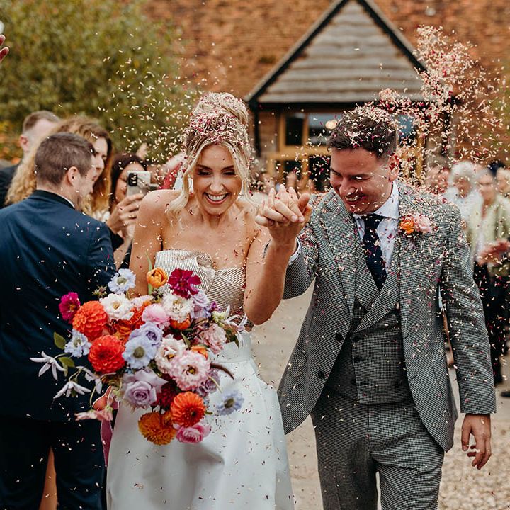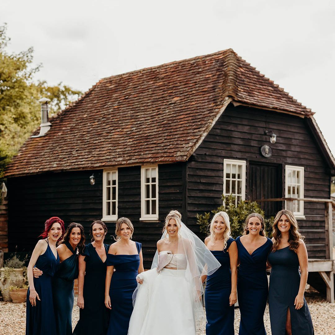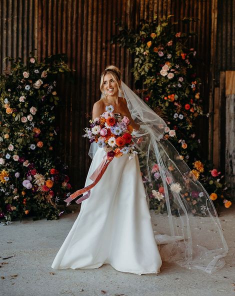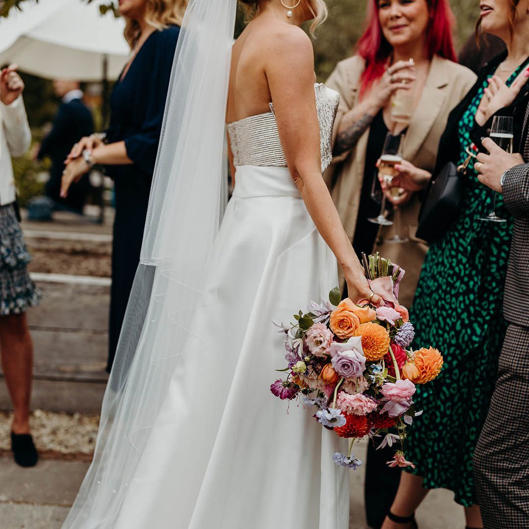 Sophie & Andi wanted their day to be a full celebration from start to finish. Styling-wise, the couple opted for wild and colourful flowers, with a rural yet contemporary aesthetic, which Silchester Farm in Hampshire provided in spades. The day started with the ultimate glam squad that made Sophie and her bridesmaids feel like a million dollars. The venue was decked out in stunning vibrant wedding flowers and those amazing flower columns! The wedding celebrant, Claire, made Sophie & Andi's wedding ceremony so personal and special and it helped to have their gorgeous little girl, in a pretty flower crown, present for the whole thing with all their other loved ones watching! Two of Sophie's friends wrote the most amazing poem about her, Andi and their daughter, which they read out at the ceremony!