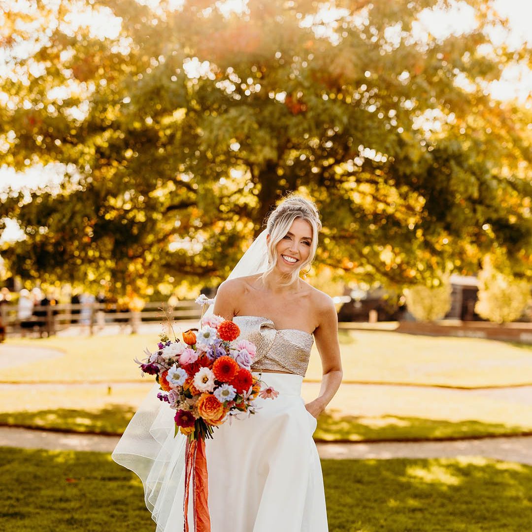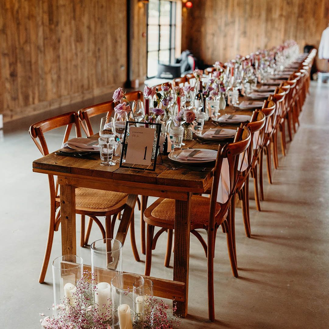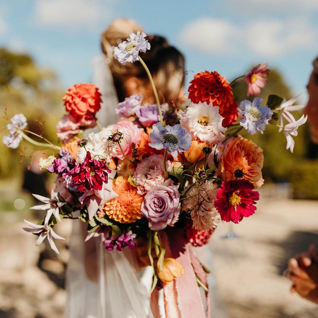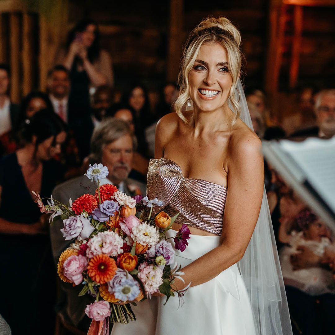 Sophie & Andi wanted their day to be a full celebration from start to finish. Styling-wise, the couple opted for wild and colourful flowers, with a rural yet contemporary aesthetic, which Silchester Farm in Hampshire provided in spades. The day started with the ultimate glam squad that made Sophie and her bridesmaids feel like a million dollars. The venue was decked out in stunning vibrant wedding flowers and those amazing flower columns! The wedding celebrant, Claire, made Sophie & Andi's wedding ceremony so personal and special and it helped to have their gorgeous little girl, in a pretty flower crown, present for the whole thing with all their other loved ones watching! Two of Sophie's friends wrote the most amazing poem about her, Andi and their daughter, which they read out at the ceremony!