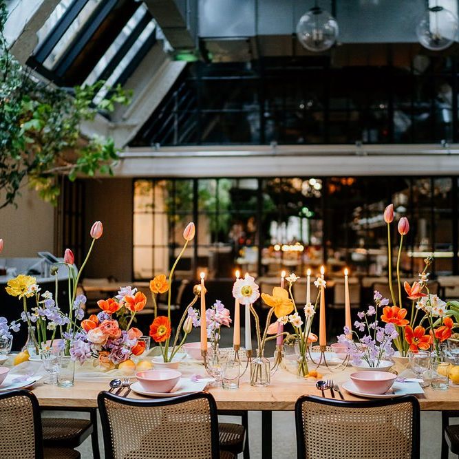 Spring is the season full of hope & excitement for what the year will bring, and the shoot reflects that in the pastel colour palette used across florals, stationery, makeup, cake & bridal accessories. The aim was to create a tablescape that focused on colour and texture, playing with heights in a more modern and Japanese inspired floral design style to create shapes and floral dense moments. We wanted to draw the eye to varying heights to give the table movement, in a playful way as opposed to traditional centrepieces. We also used tulle table runners for a soft but fresh feel.