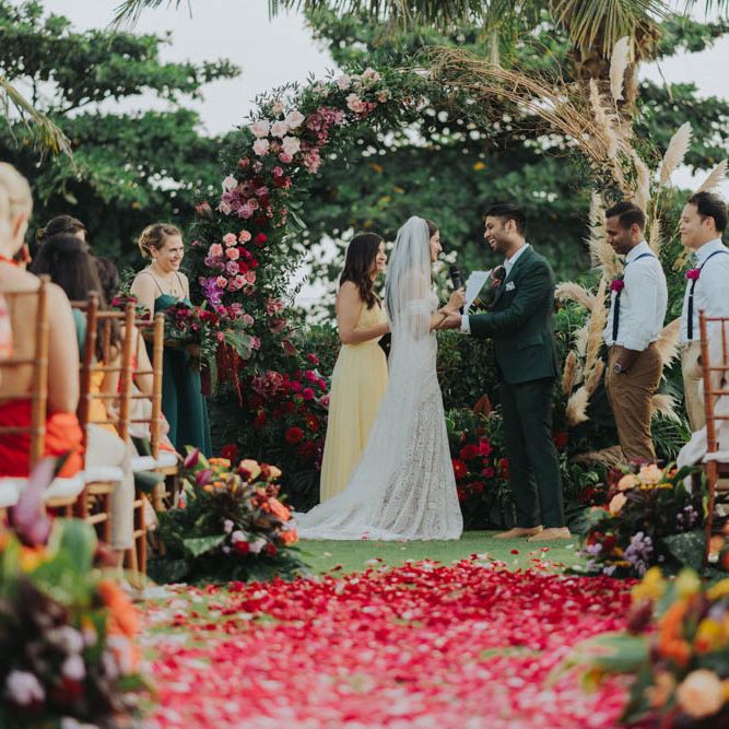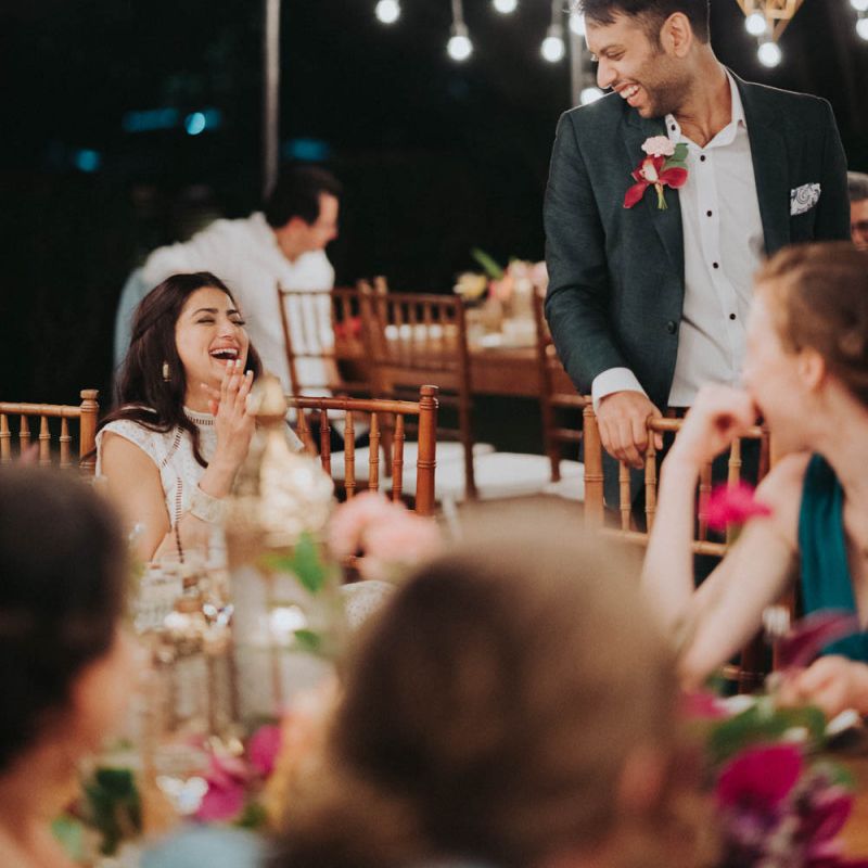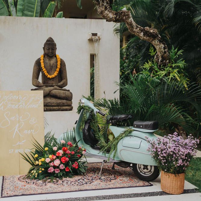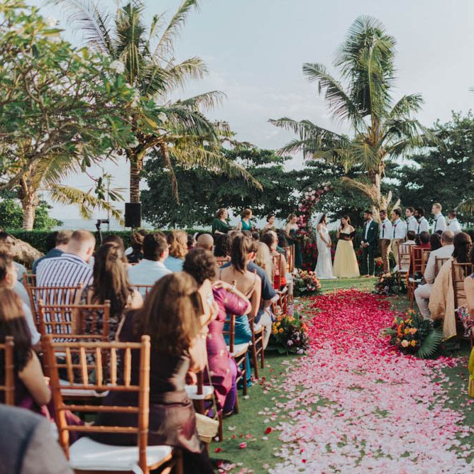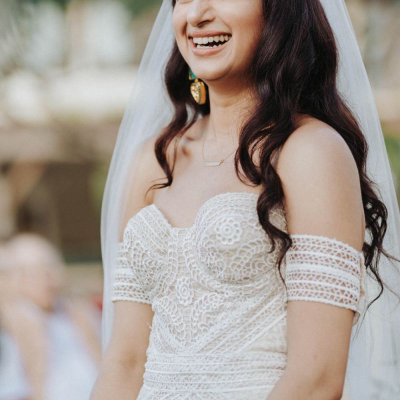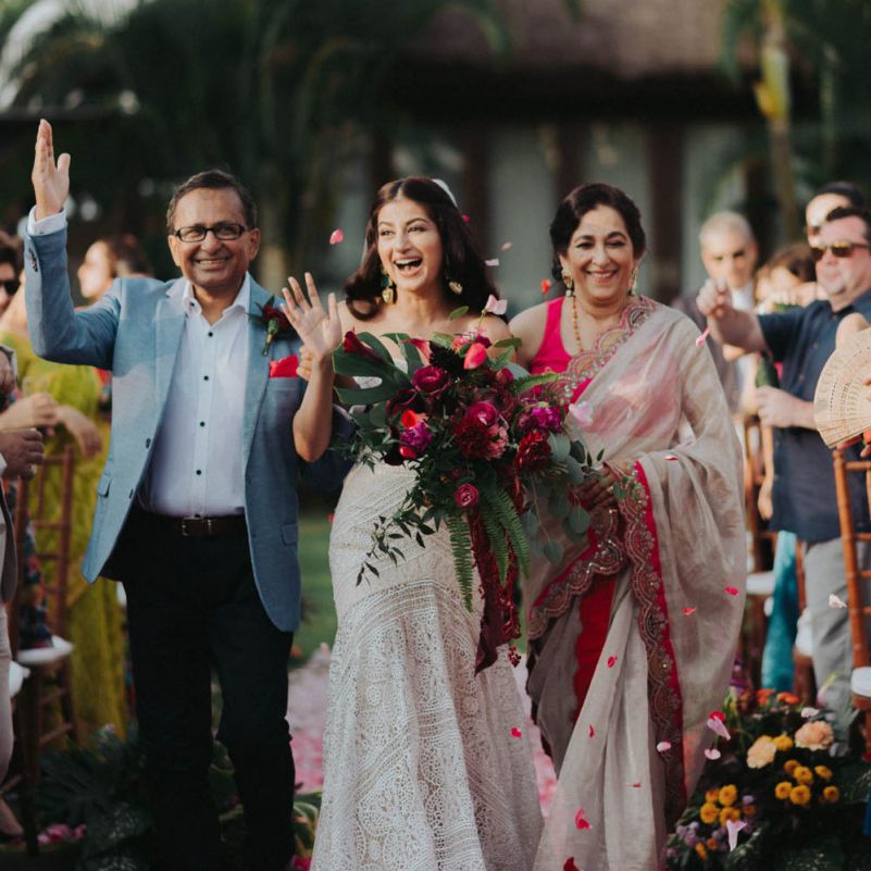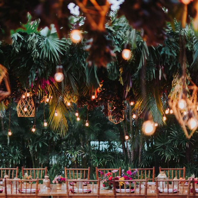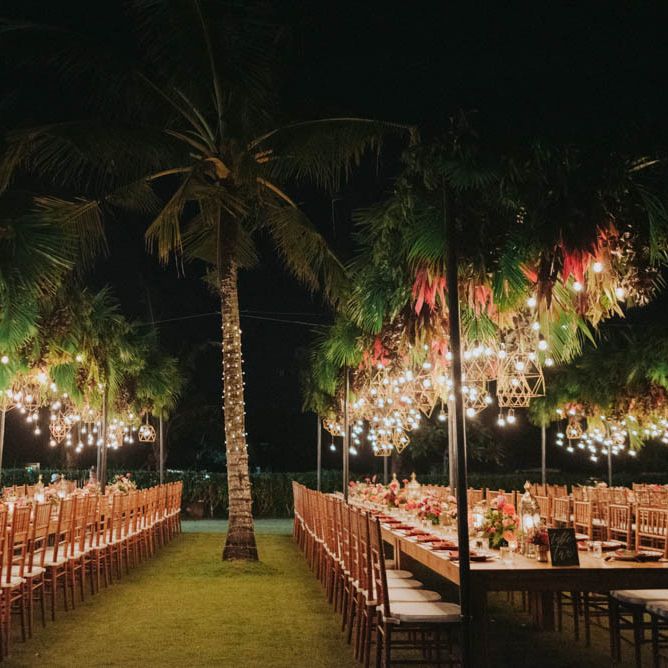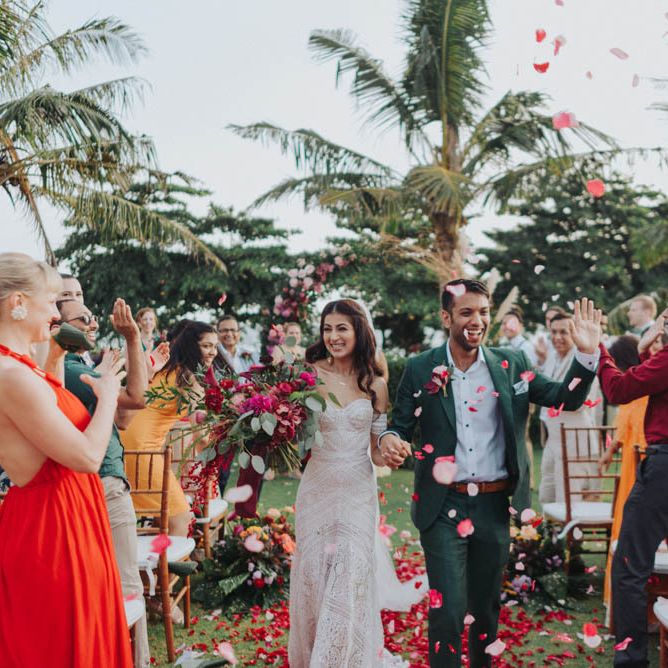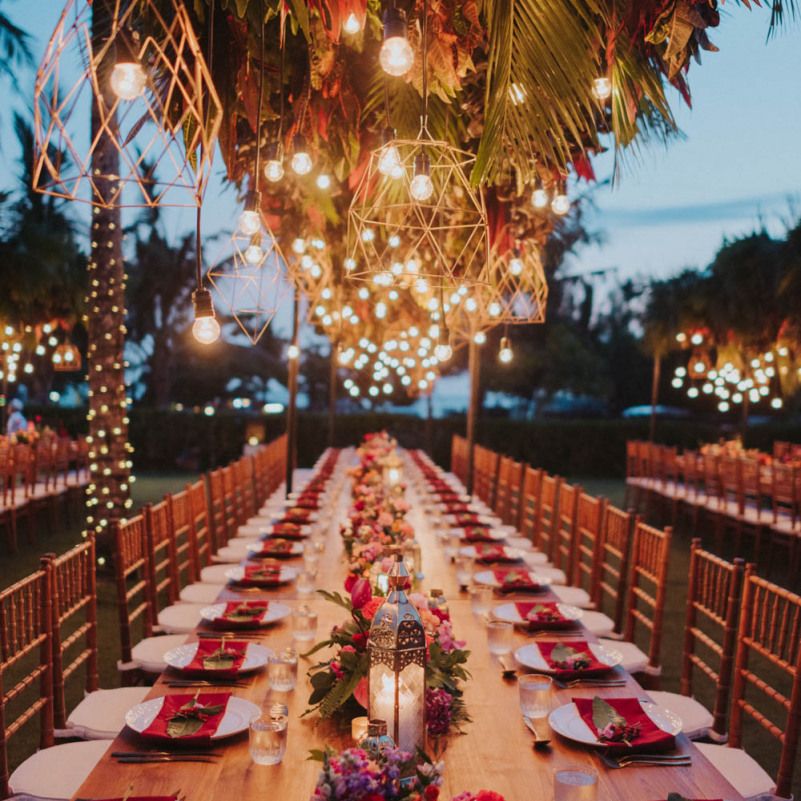 Bright, bohemian, wonderland! We are both of Indian background and wanted to bring the colorful ethos of our culture to our wedding. From the gold lanterns to the bright pops of fuchsia and red, we wove in our traditional Indian elements with the Balinese atmosphere. Bali has always felt like a magical place to us—a wonderland—so we wanted to recreate that magic for our guests as this was the first time most of them had been to Bali. Our theme was “where the jungle meets the sea”—recreating the lush jungles of Indonesia with the ocean-front venue. It was supposed to feel like fairies had just deserted the place moments earlier, and we captured that whimsy with tables in the bushes that had a slice of cake, a glass of champagne and a note that said "Eat Me" and "Drink Me", tepees with a sign that said "This is a good kissing spot" and a bunch of other things for our guests to "discover" if they chose.