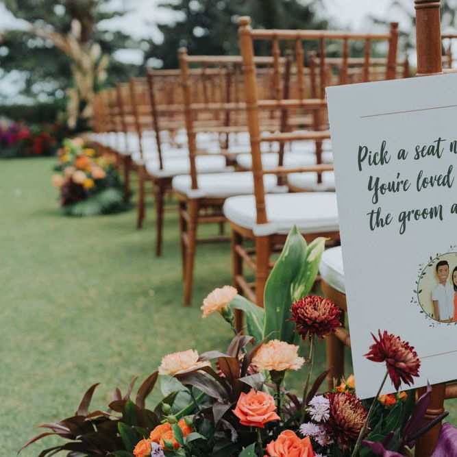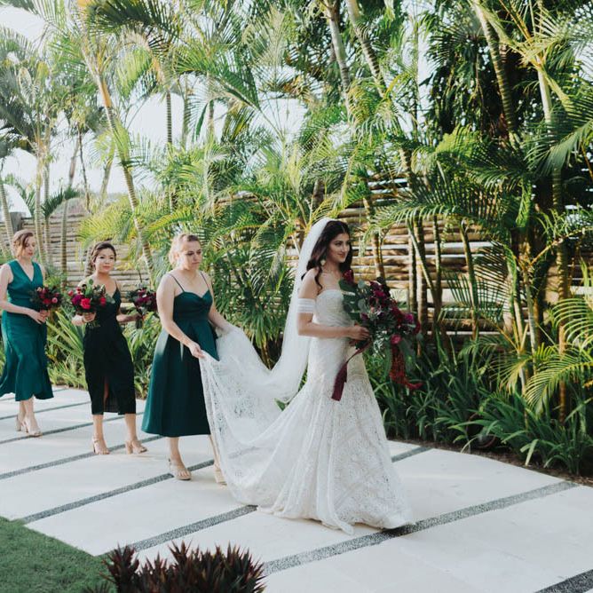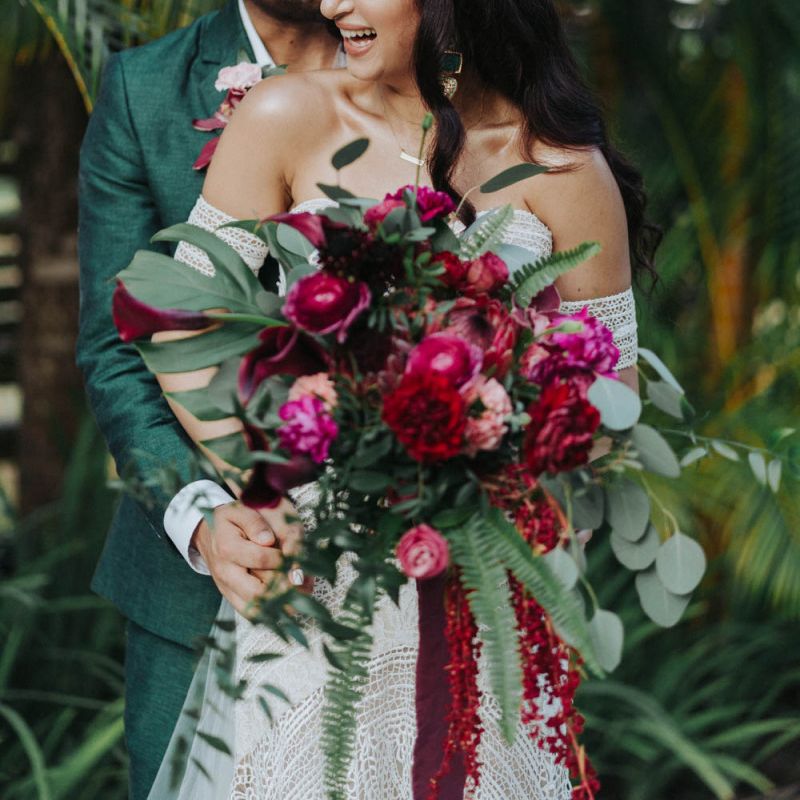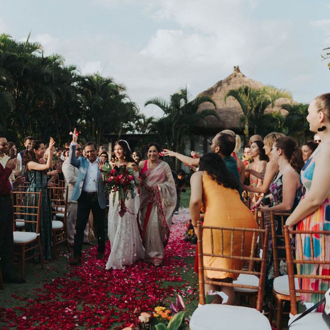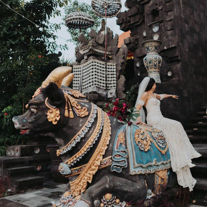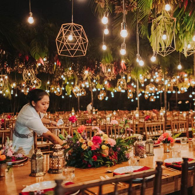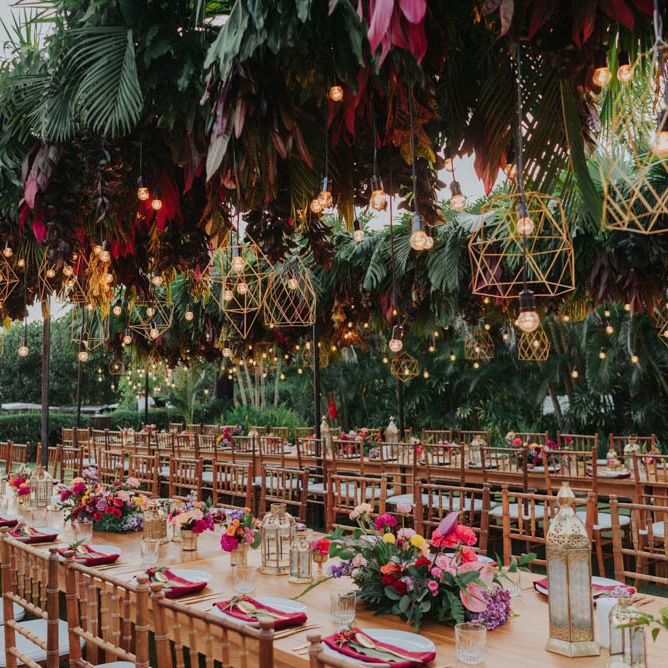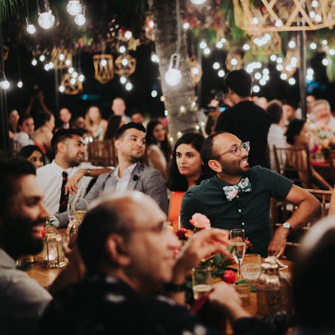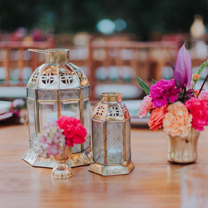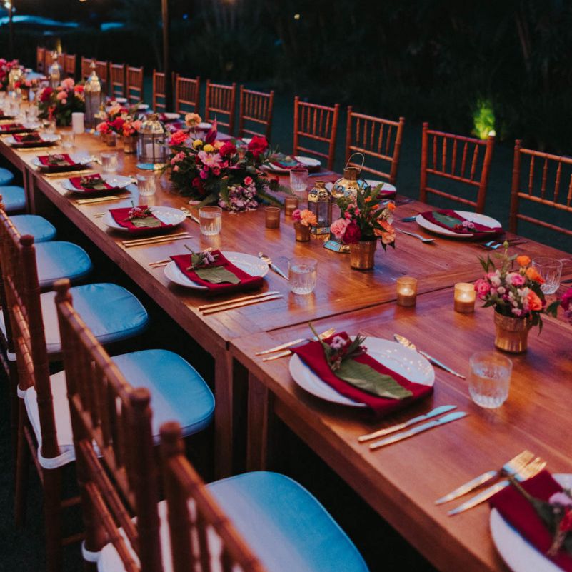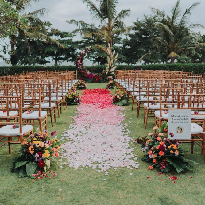 Bright, bohemian, wonderland! We are both of Indian background and wanted to bring the colorful ethos of our culture to our wedding. From the gold lanterns to the bright pops of fuchsia and red, we wove in our traditional Indian elements with the Balinese atmosphere. Bali has always felt like a magical place to us—a wonderland—so we wanted to recreate that magic for our guests as this was the first time most of them had been to Bali. Our theme was “where the jungle meets the sea”—recreating the lush jungles of Indonesia with the ocean-front venue. It was supposed to feel like fairies had just deserted the place moments earlier, and we captured that whimsy with tables in the bushes that had a slice of cake, a glass of champagne and a note that said "Eat Me" and "Drink Me", tepees with a sign that said "This is a good kissing spot" and a bunch of other things for our guests to "discover" if they chose.