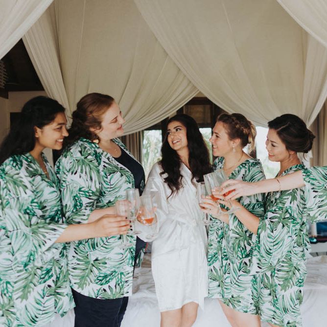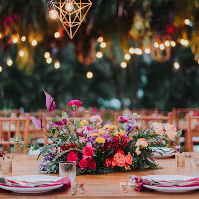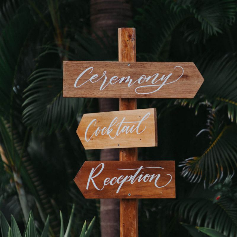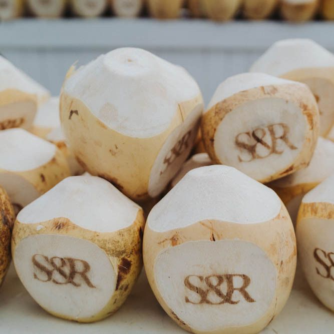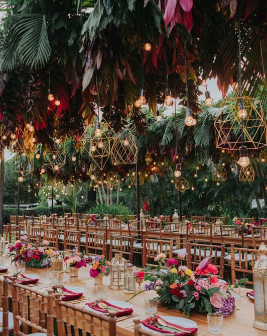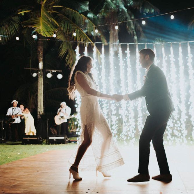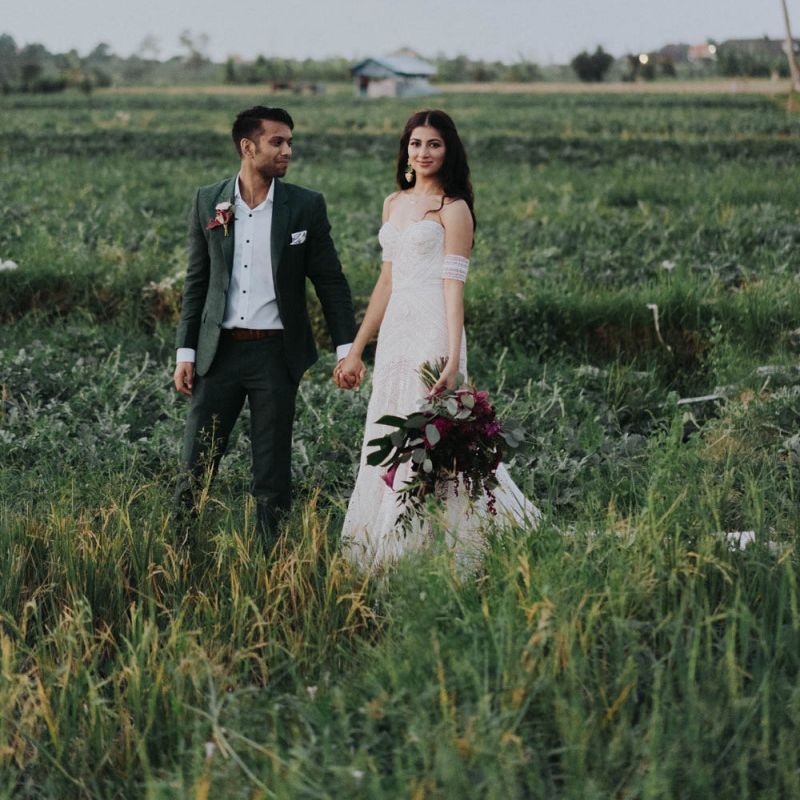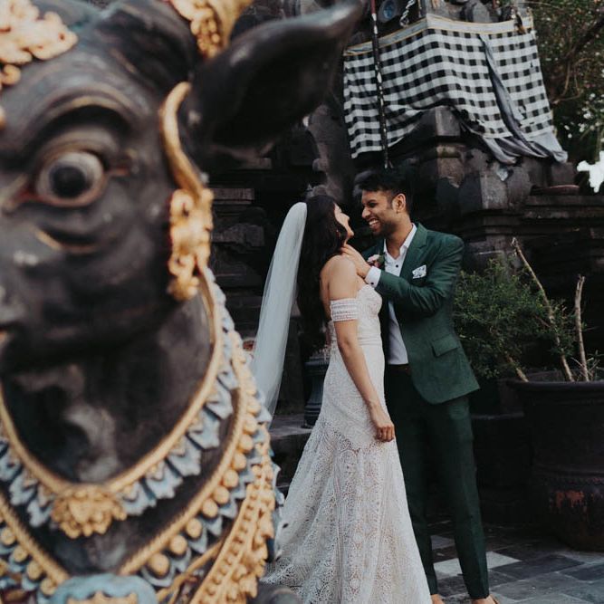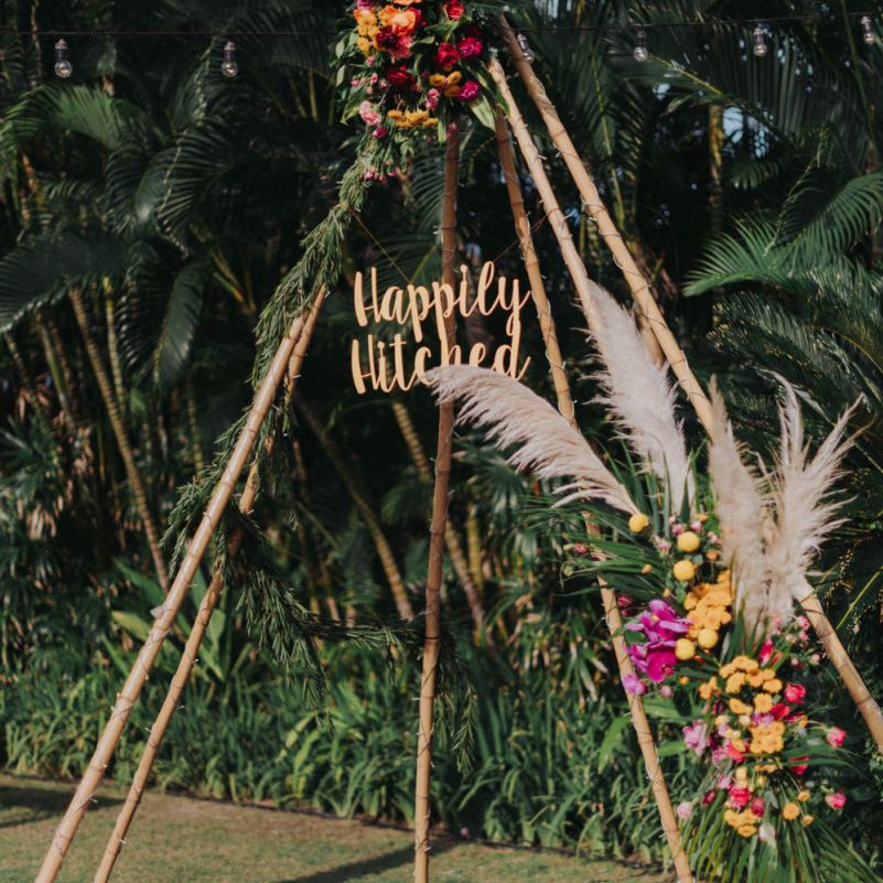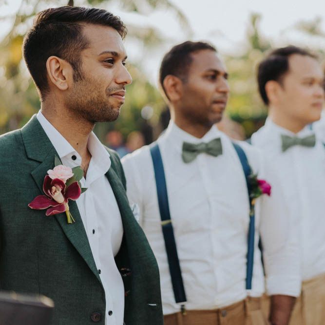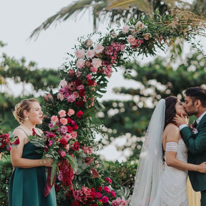 Bright, bohemian, wonderland! We are both of Indian background and wanted to bring the colorful ethos of our culture to our wedding. From the gold lanterns to the bright pops of fuchsia and red, we wove in our traditional Indian elements with the Balinese atmosphere. Bali has always felt like a magical place to us—a wonderland—so we wanted to recreate that magic for our guests as this was the first time most of them had been to Bali. Our theme was “where the jungle meets the sea”—recreating the lush jungles of Indonesia with the ocean-front venue. It was supposed to feel like fairies had just deserted the place moments earlier, and we captured that whimsy with tables in the bushes that had a slice of cake, a glass of champagne and a note that said "Eat Me" and "Drink Me", tepees with a sign that said "This is a good kissing spot" and a bunch of other things for our guests to "discover" if they chose.