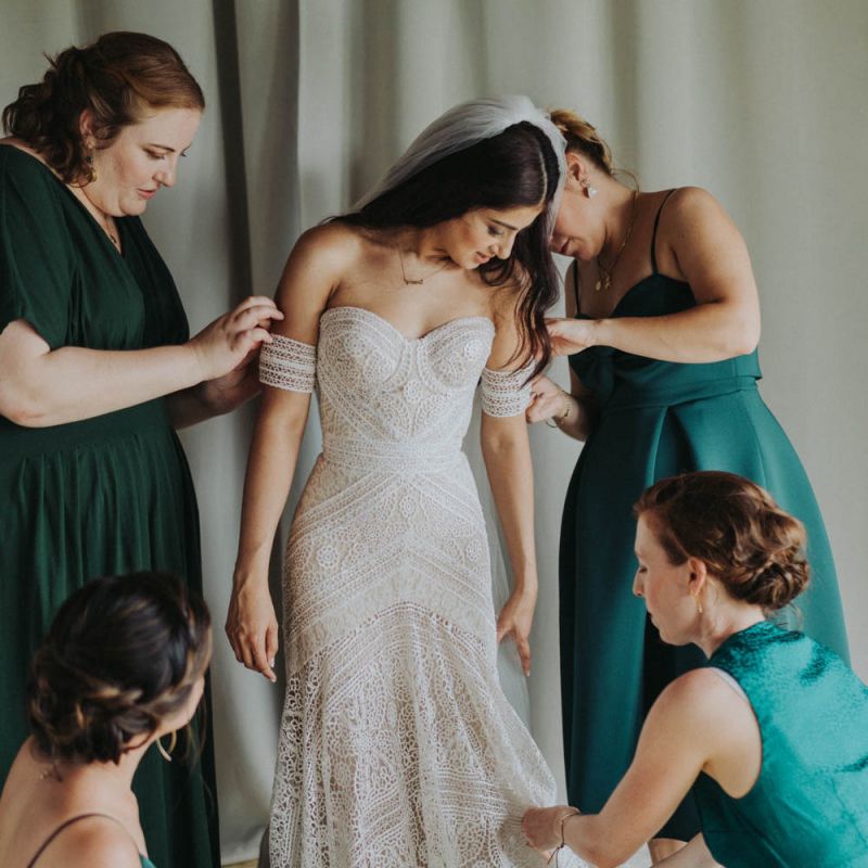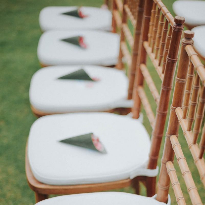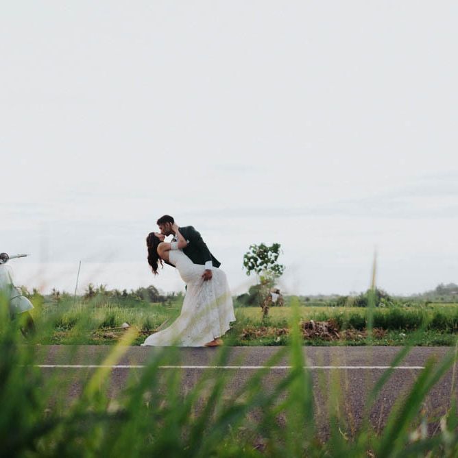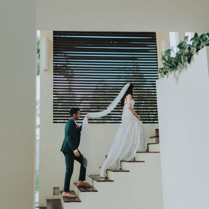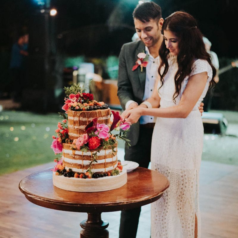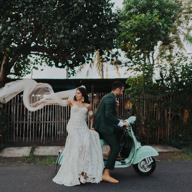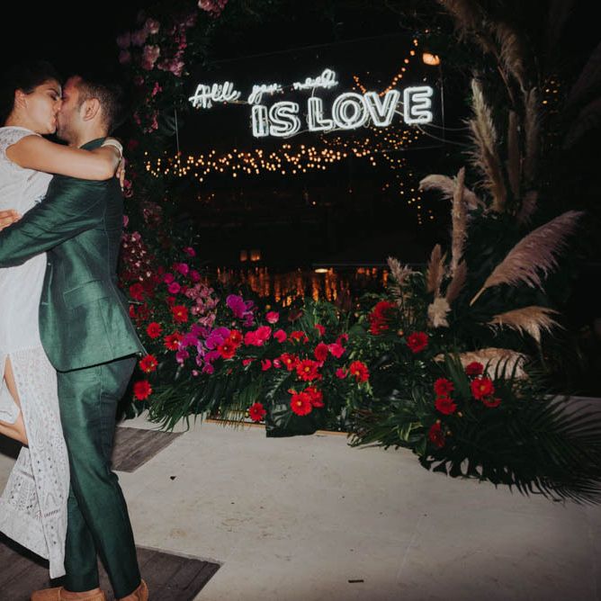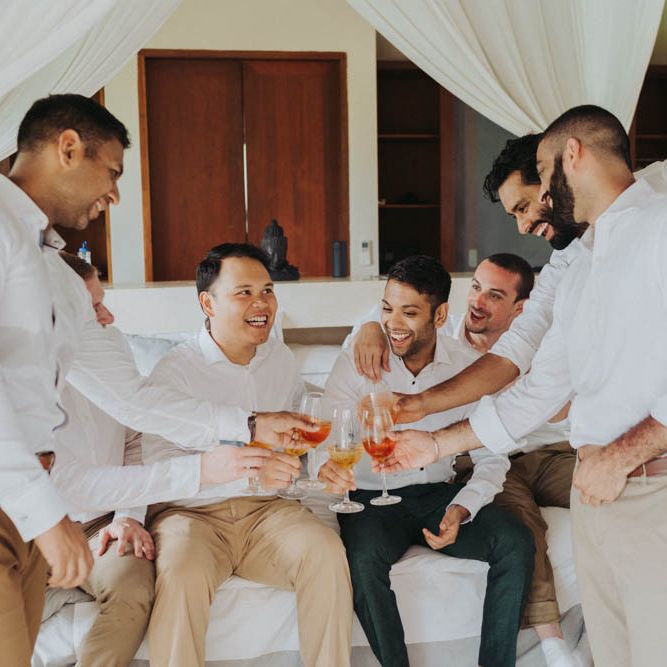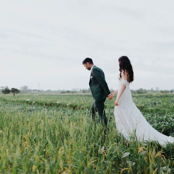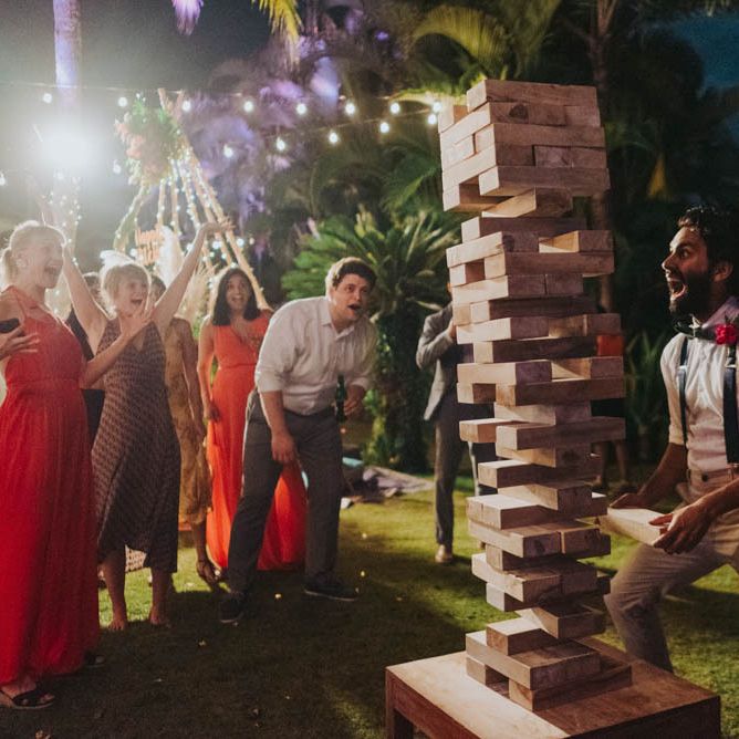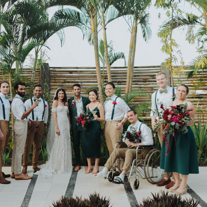 Bright, bohemian, wonderland! We are both of Indian background and wanted to bring the colorful ethos of our culture to our wedding. From the gold lanterns to the bright pops of fuchsia and red, we wove in our traditional Indian elements with the Balinese atmosphere. Bali has always felt like a magical place to us—a wonderland—so we wanted to recreate that magic for our guests as this was the first time most of them had been to Bali. Our theme was “where the jungle meets the sea”—recreating the lush jungles of Indonesia with the ocean-front venue. It was supposed to feel like fairies had just deserted the place moments earlier, and we captured that whimsy with tables in the bushes that had a slice of cake, a glass of champagne and a note that said "Eat Me" and "Drink Me", tepees with a sign that said "This is a good kissing spot" and a bunch of other things for our guests to "discover" if they chose.