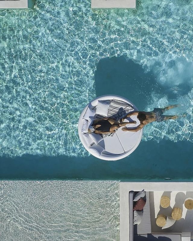 Couple enjoying a romantic moment at Once in Mykonos infinity pool – bride relaxing on a luxury white sunbed in pool while groom swims in crystal-clear water - Once In Mykonos Honeymoon Hotel Review