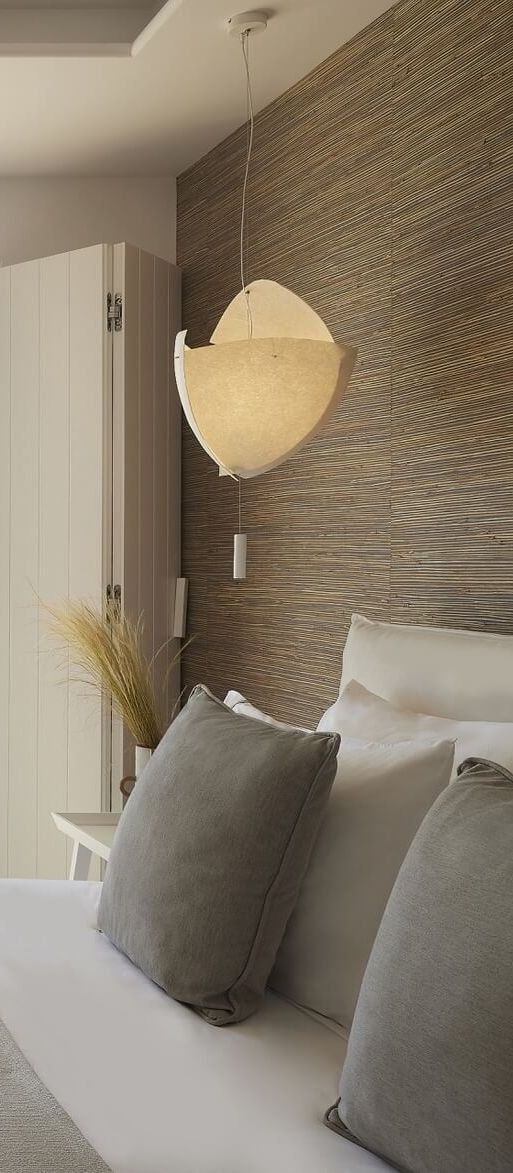 Luxury suite at Once In Mykonos hotel with soft neutral decor, opening onto a private terrace with panoramic views of Ornos Bay and anchored yachts