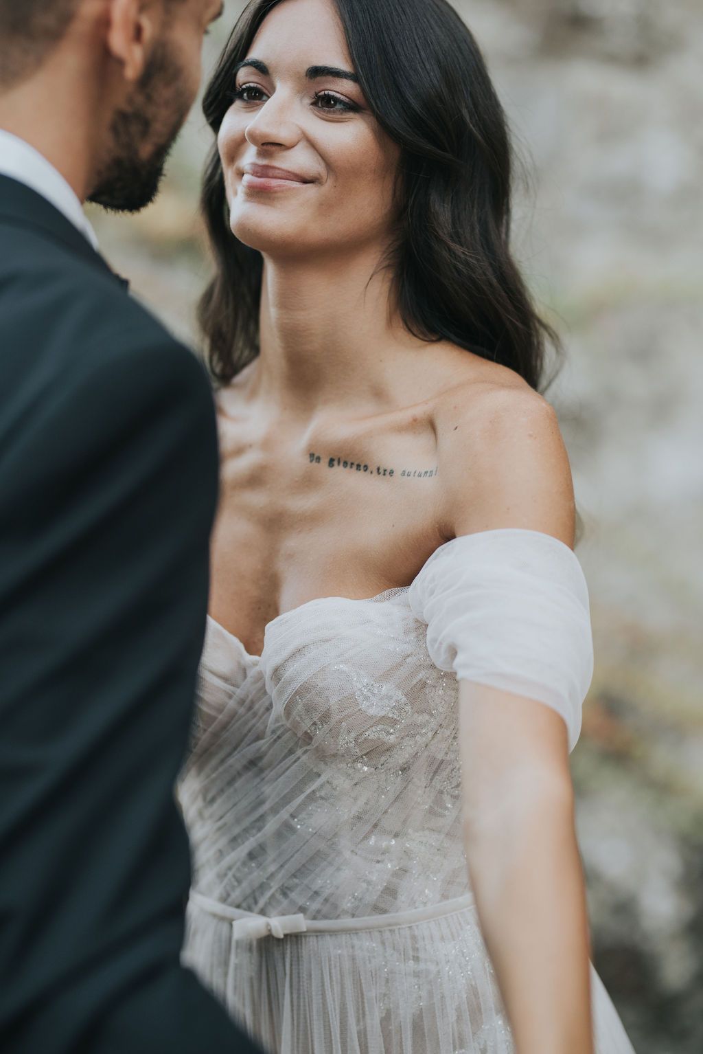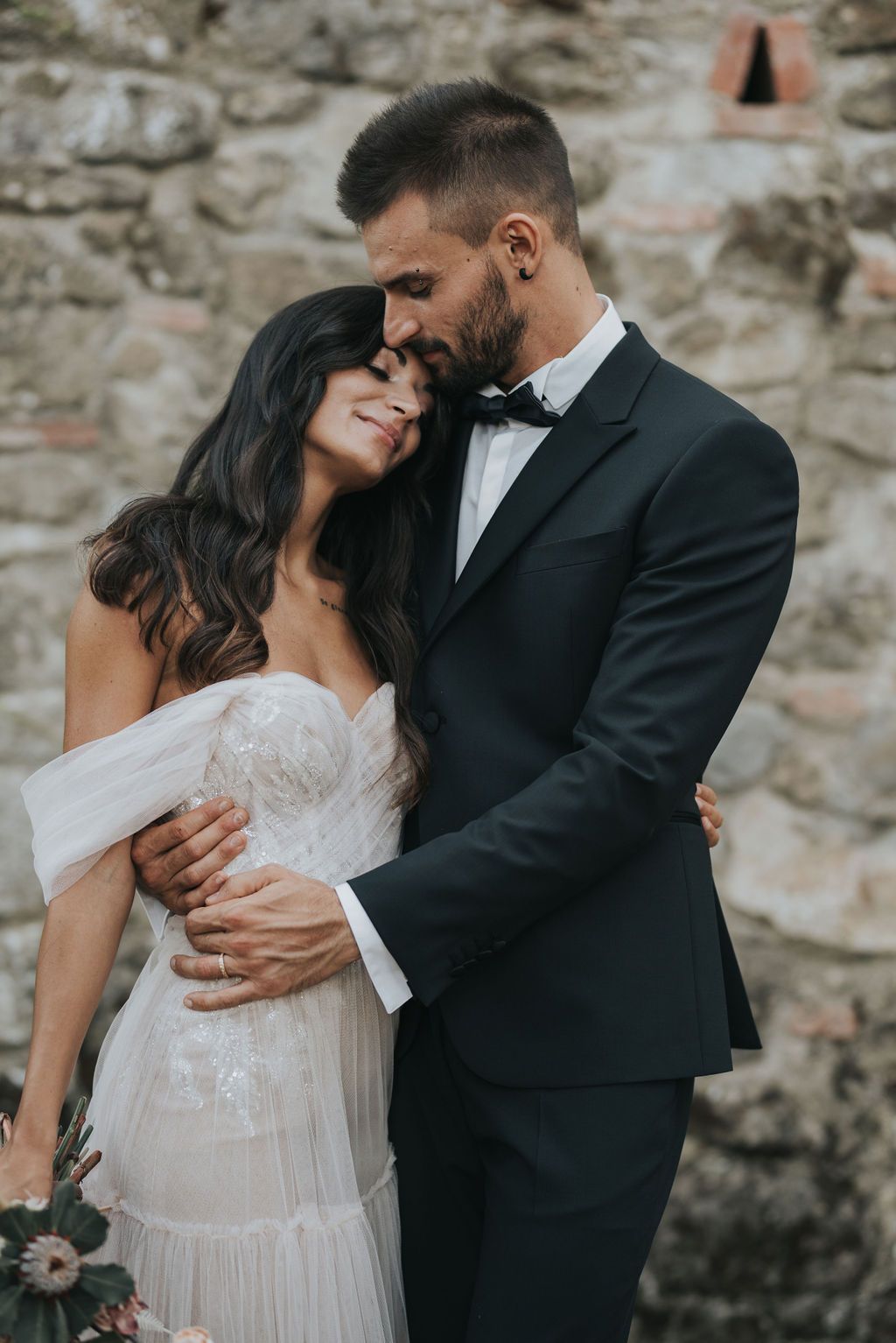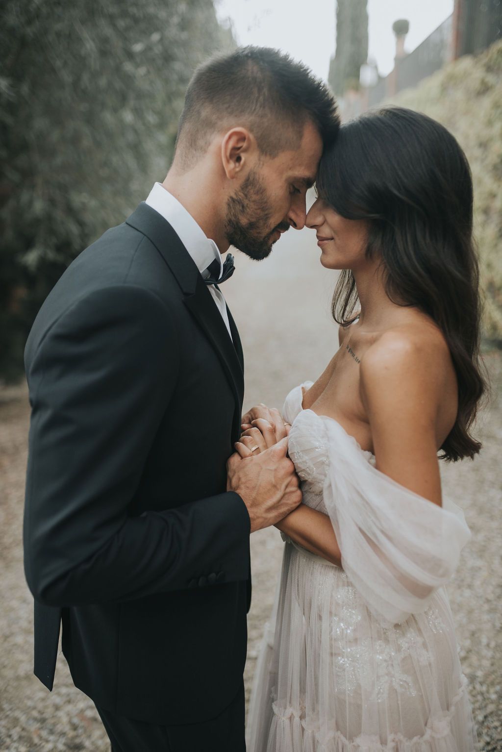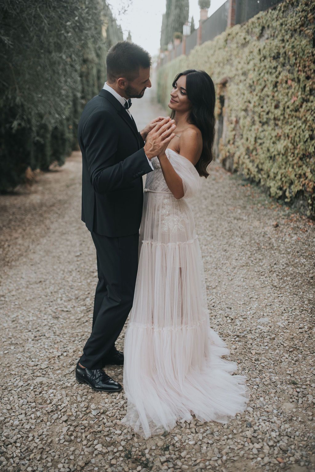 Tuscany Elopement With First Look And Off The Shoulder Wedding Dress