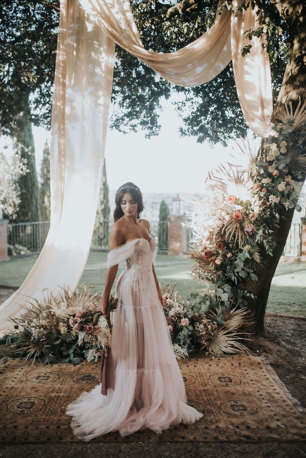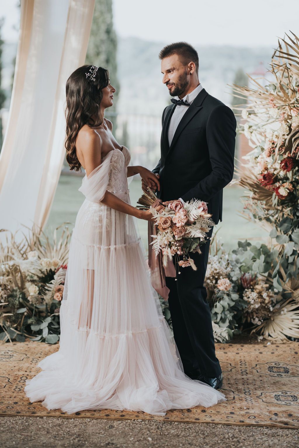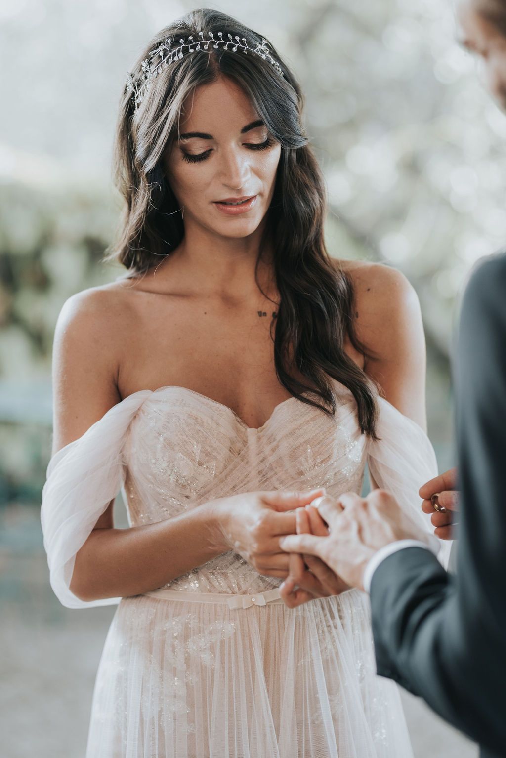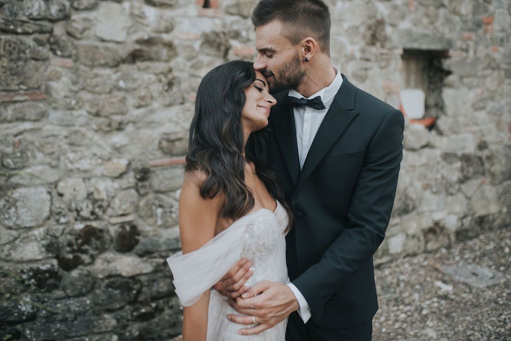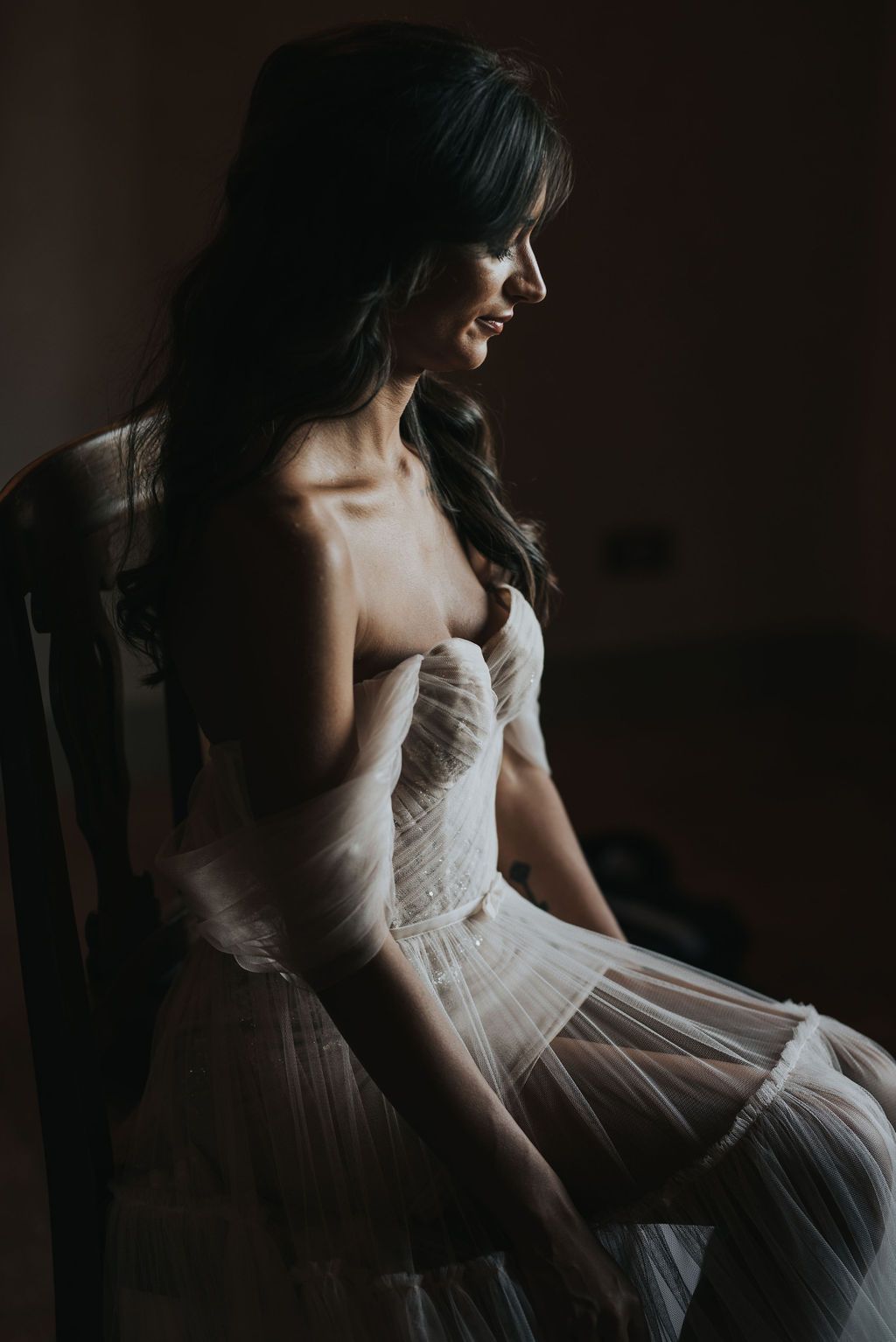 Tuscany Elopement With First Look And Off The Shoulder Wedding Dress
