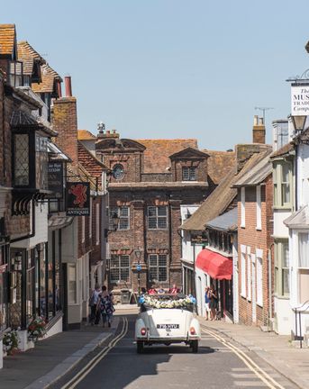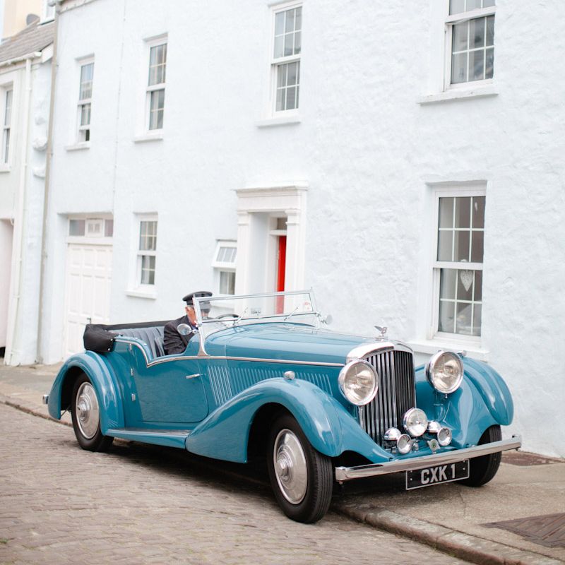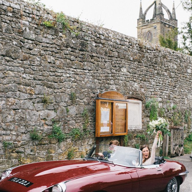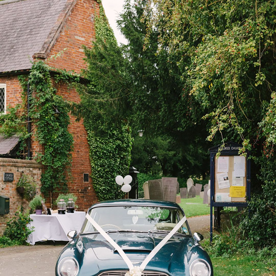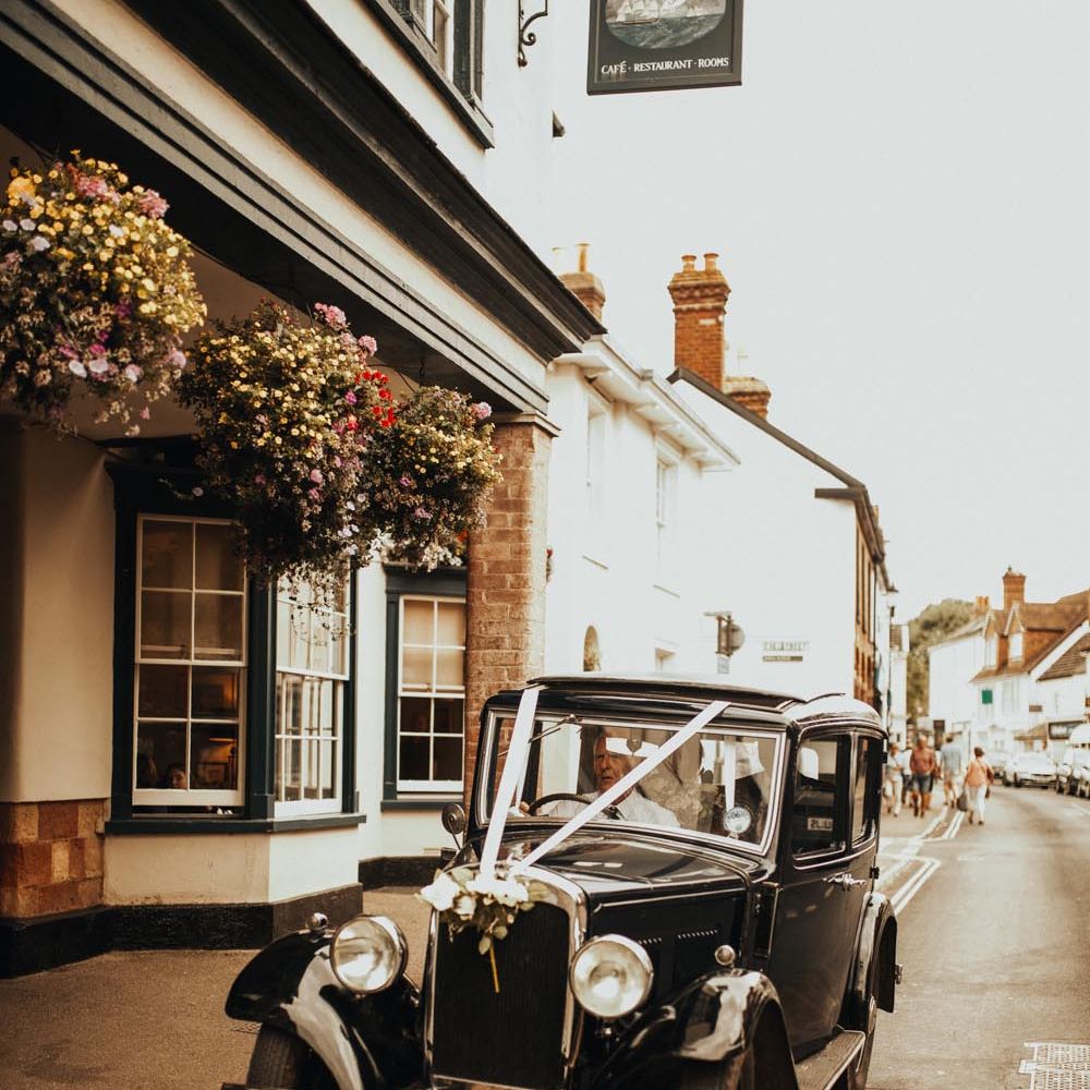 Morris Minor Wedding Car, Hanging Flowers in Bottles and Town Crier for Village Hall Wedding in Rye