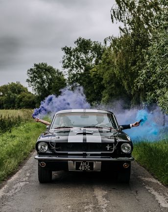 Ford Mustang Wedding Car and Smoke Bomb Portraits for a Rustic Wedding at East Yorkshire Barns