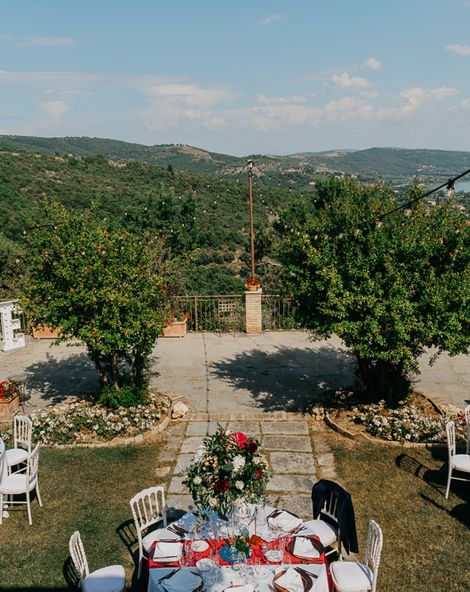 Wanted the decor to link to the setting. Being outdoor in the middle of Umbria we needed vibrant colours, rustic styling. I chose, raspberry red and copper. Copper cutlery, copper table name stands. Copper writing on stationery. Then raspberry table runners, red, pink raspberry flowers intertwined with white and plenty of greenery to keep the rural style. Crates dotted everywhere for decoration. I scoured