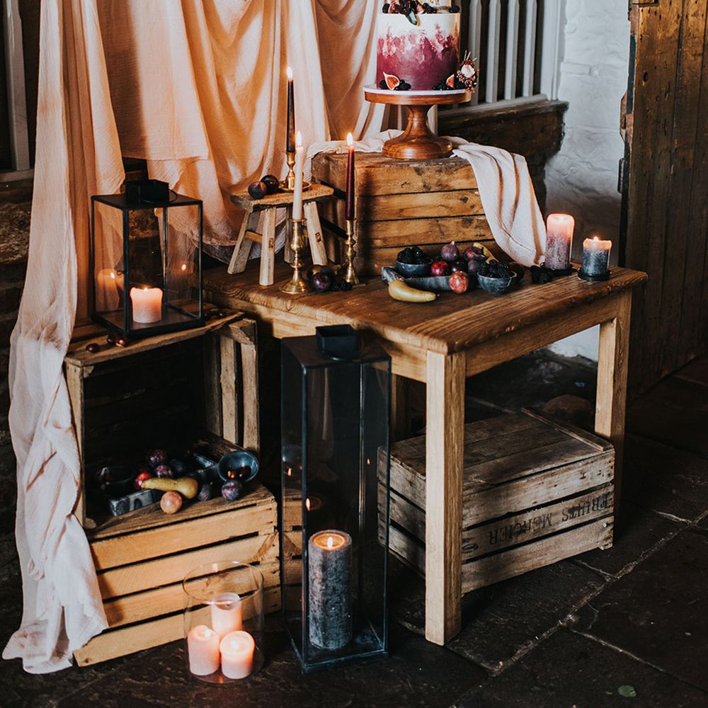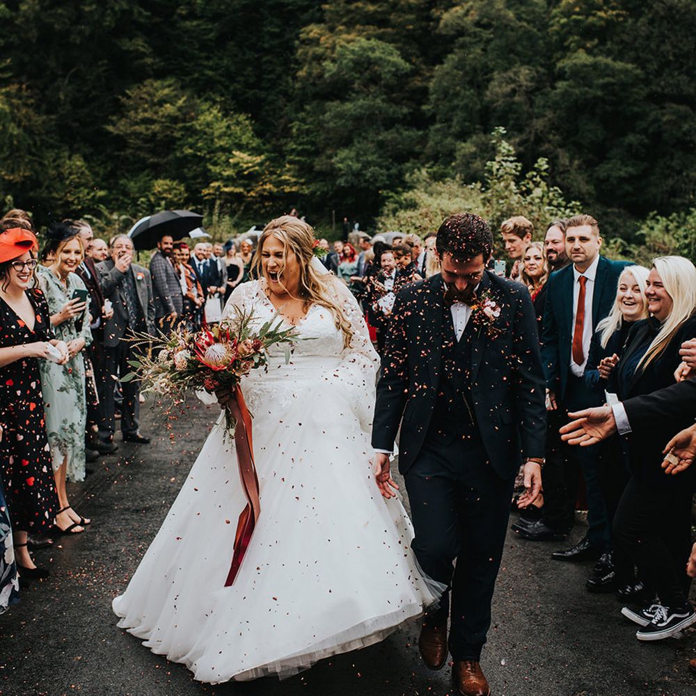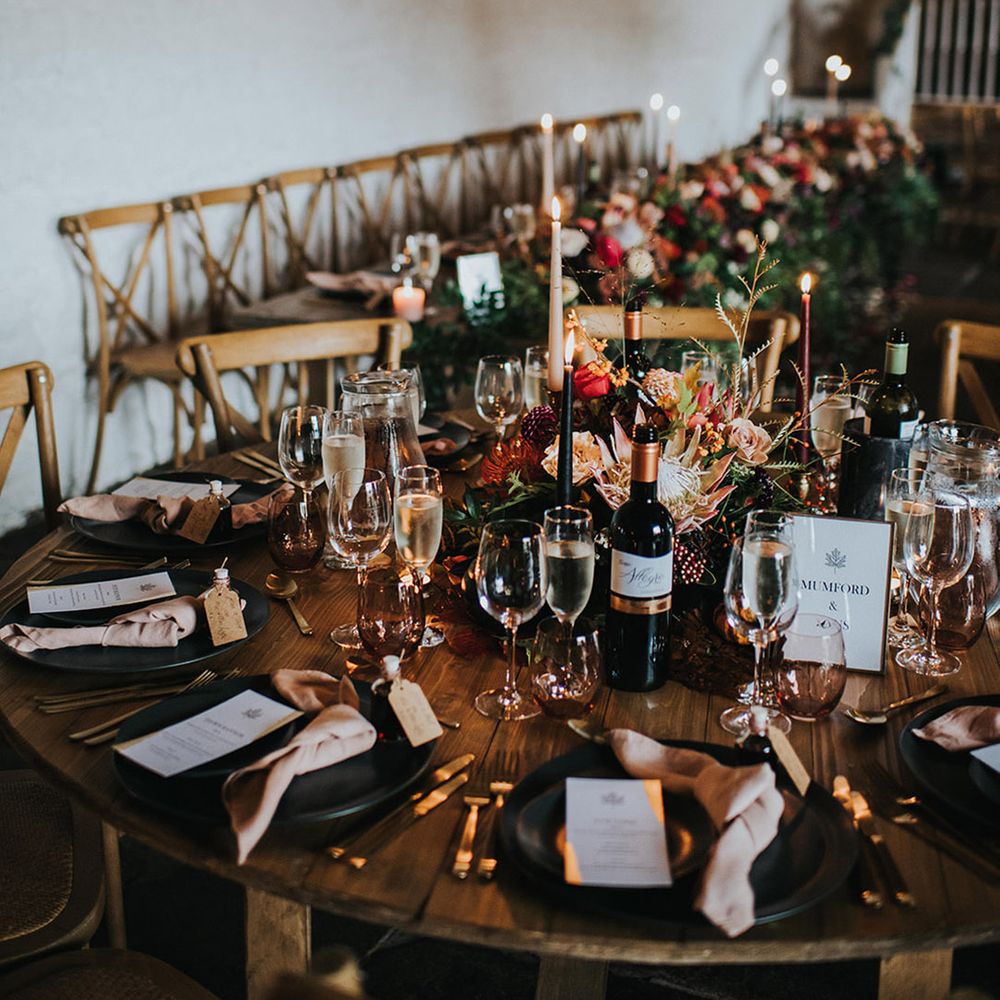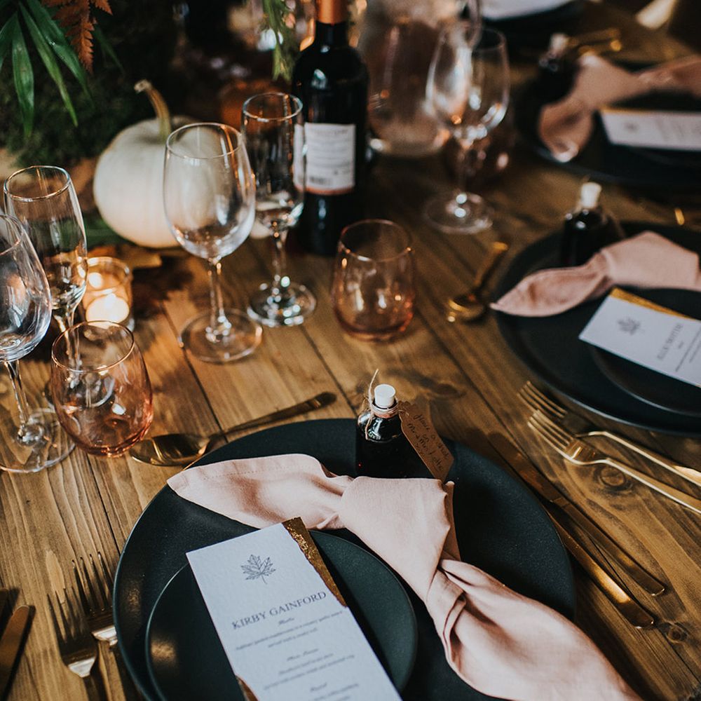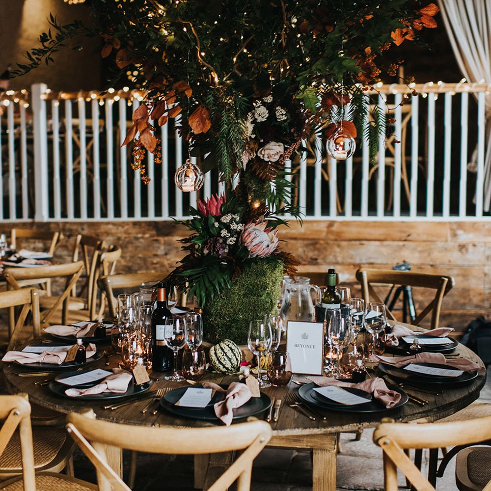 We had an autumnal woodland vibe with a cosy and laid back party atmosphere. It rained the majority of the day but we embraced it and danced in the rain! Our beautiful dogs Willow and Nellie were there and we had a glitter bar and vintage photo booth to keep guests entertained. All our tables were named after our favourite musicians and we had homemade blackberry vodka shots for favours.