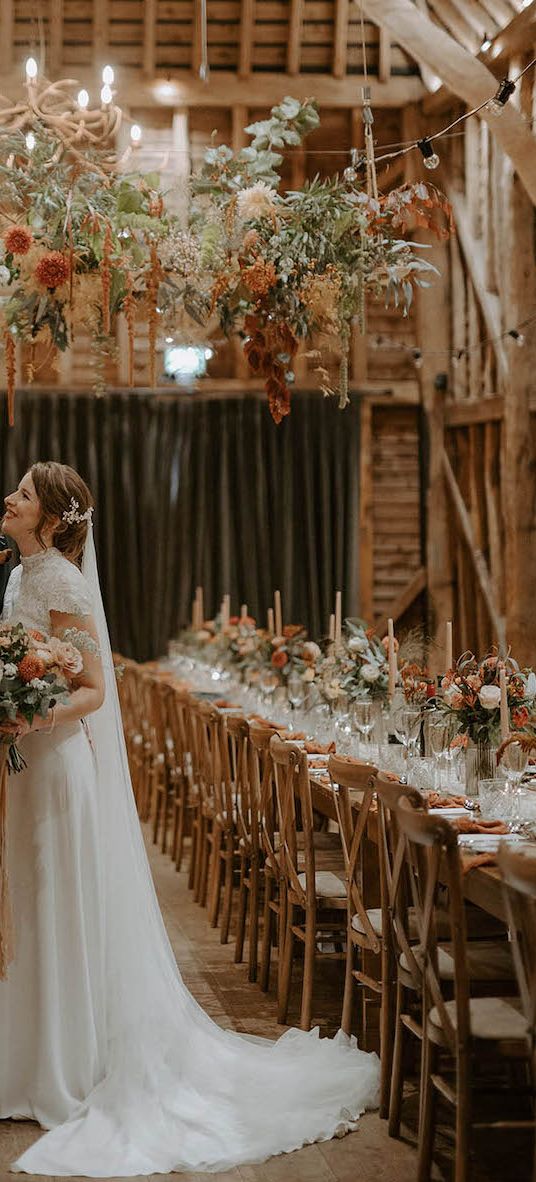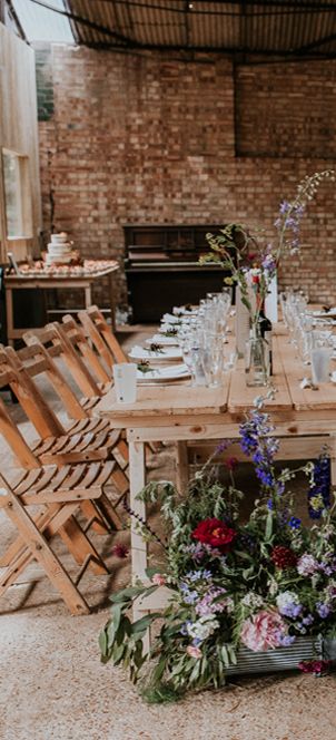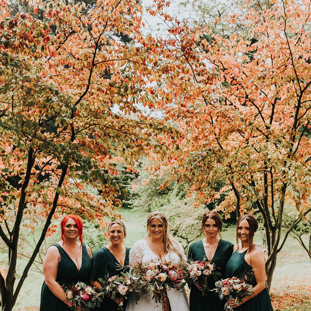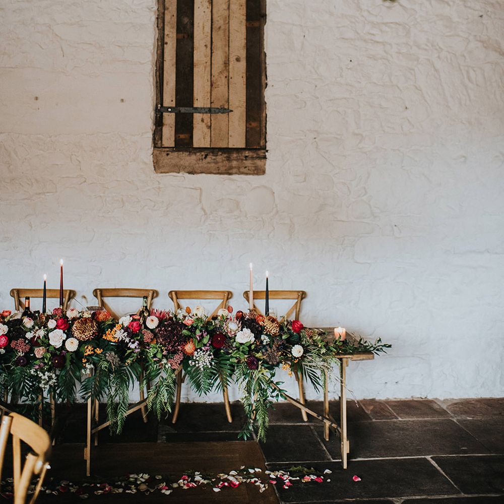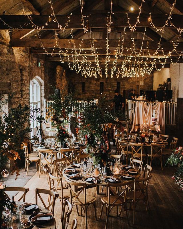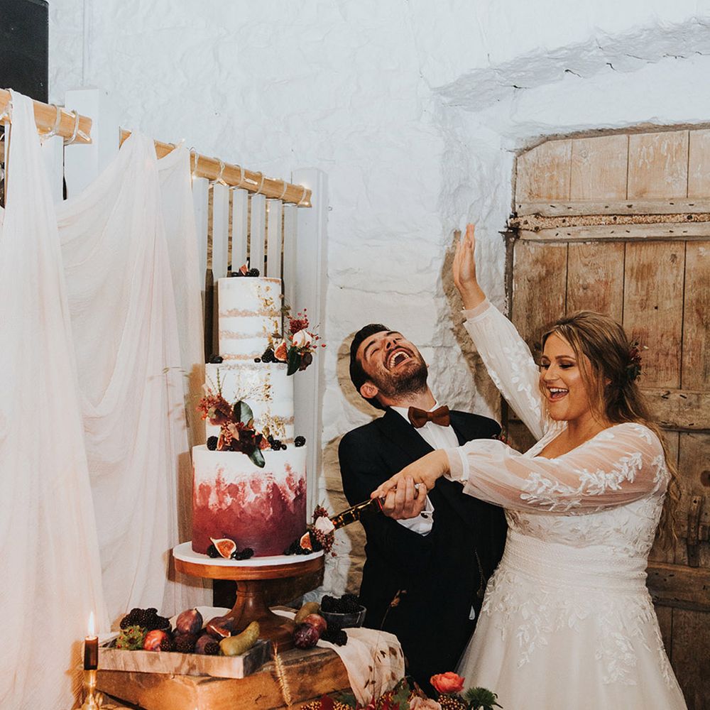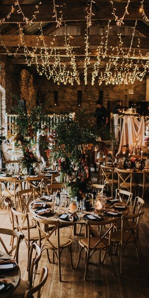 We had an autumnal woodland vibe with a cosy and laid back party atmosphere. It rained the majority of the day but we embraced it and danced in the rain! Our beautiful dogs Willow and Nellie were there and we had a glitter bar and vintage photo booth to keep guests entertained. All our tables were named after our favourite musicians and we had homemade blackberry vodka shots for favours.