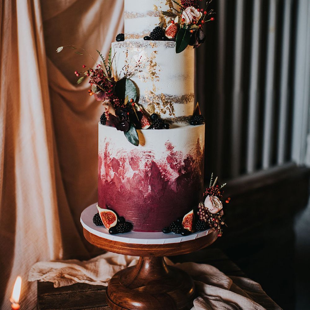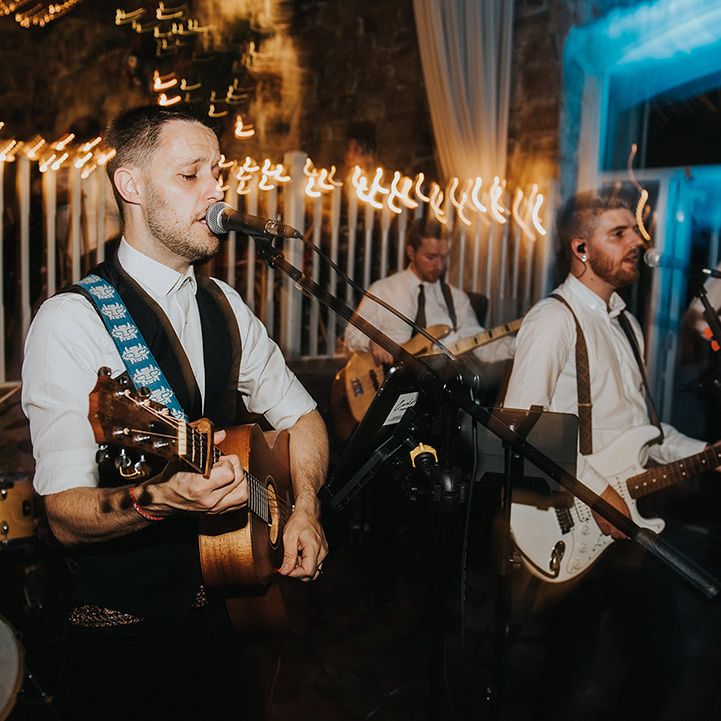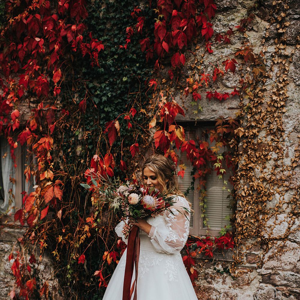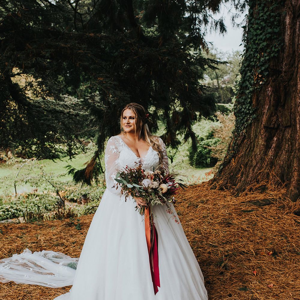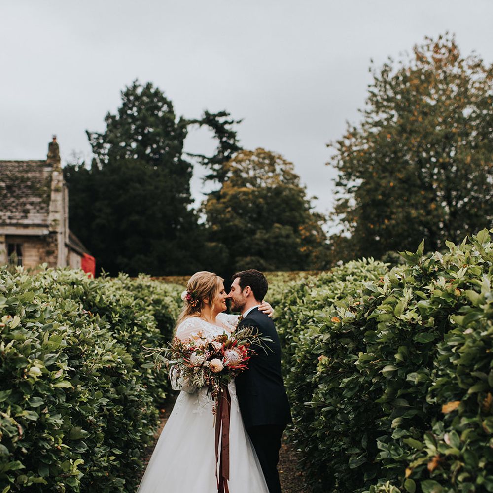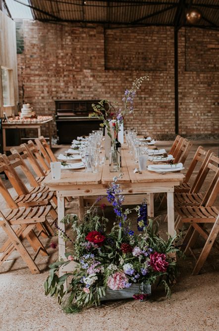 We had an autumnal woodland vibe with a cosy and laid back party atmosphere. It rained the majority of the day but we embraced it and danced in the rain! Our beautiful dogs Willow and Nellie were there and we had a glitter bar and vintage photo booth to keep guests entertained. All our tables were named after our favourite musicians and we had homemade blackberry vodka shots for favours.