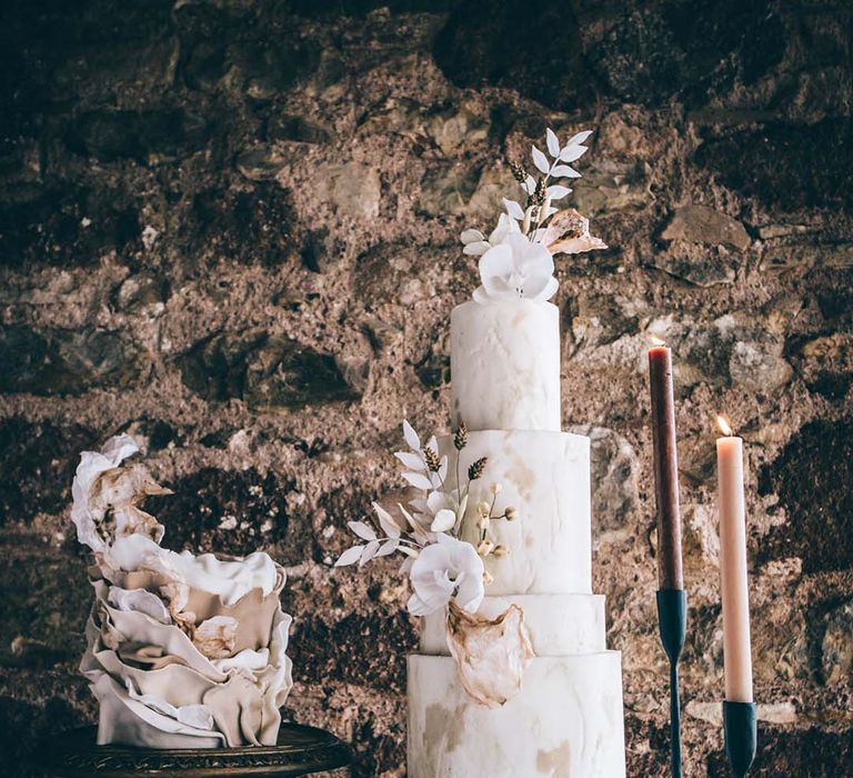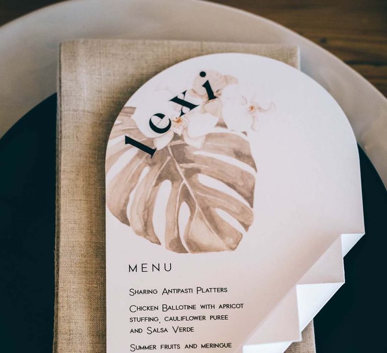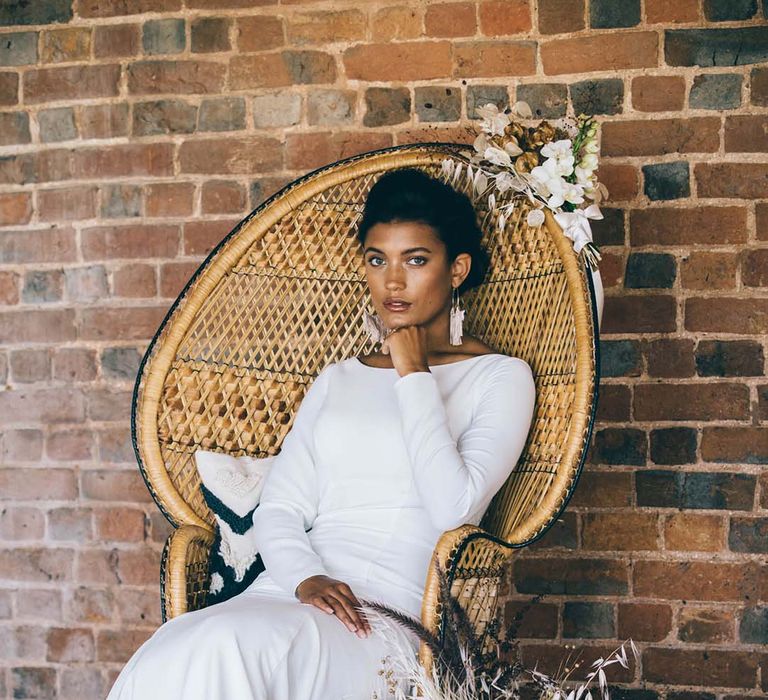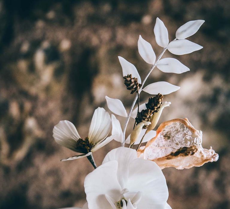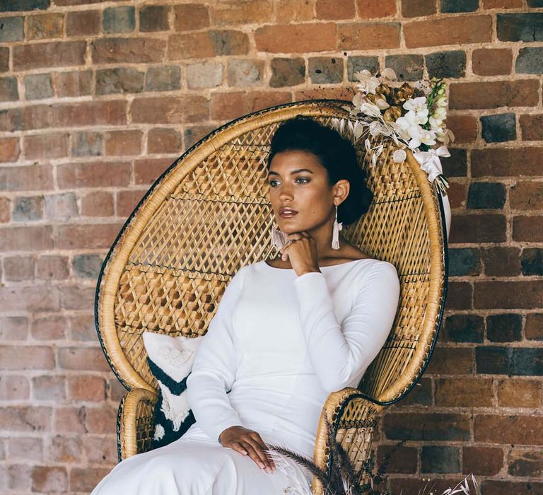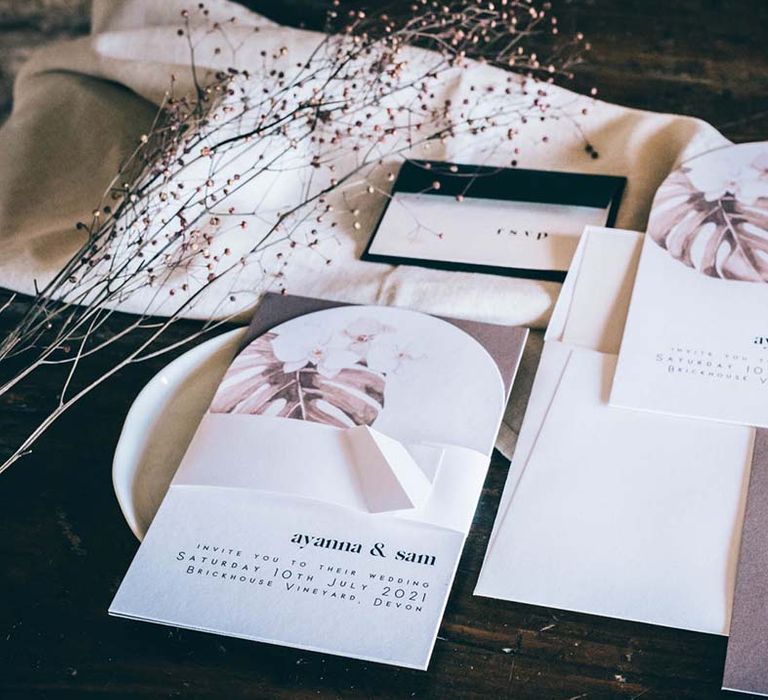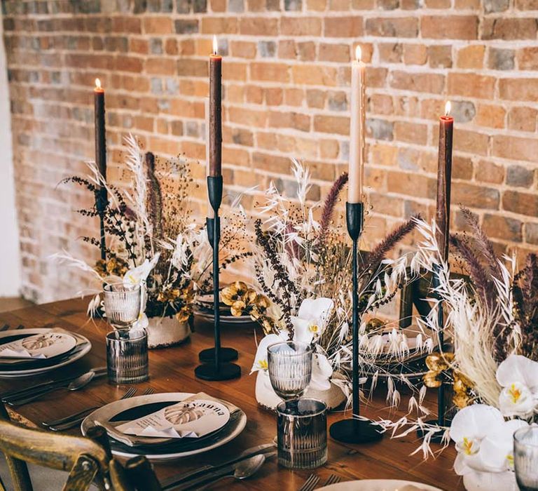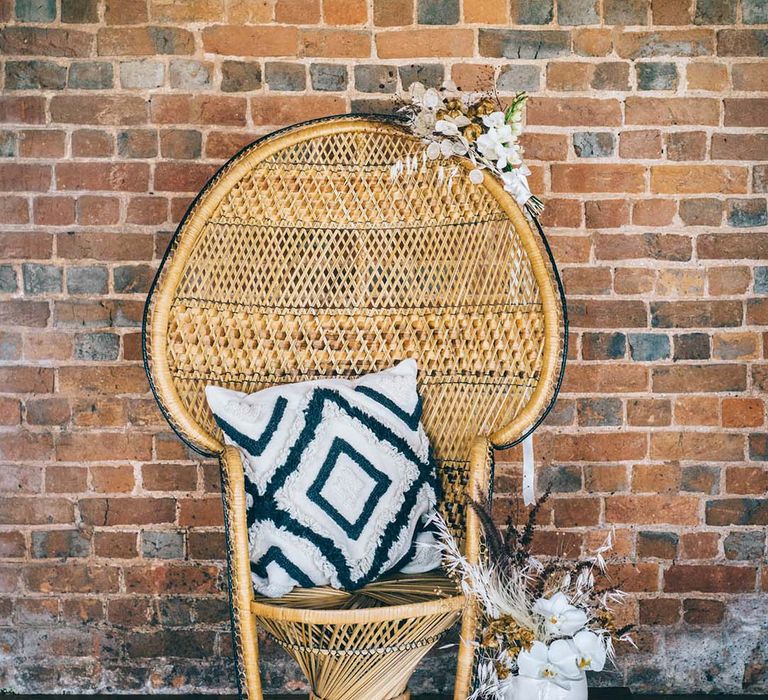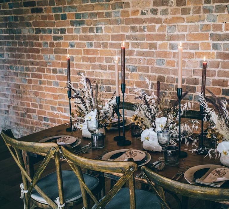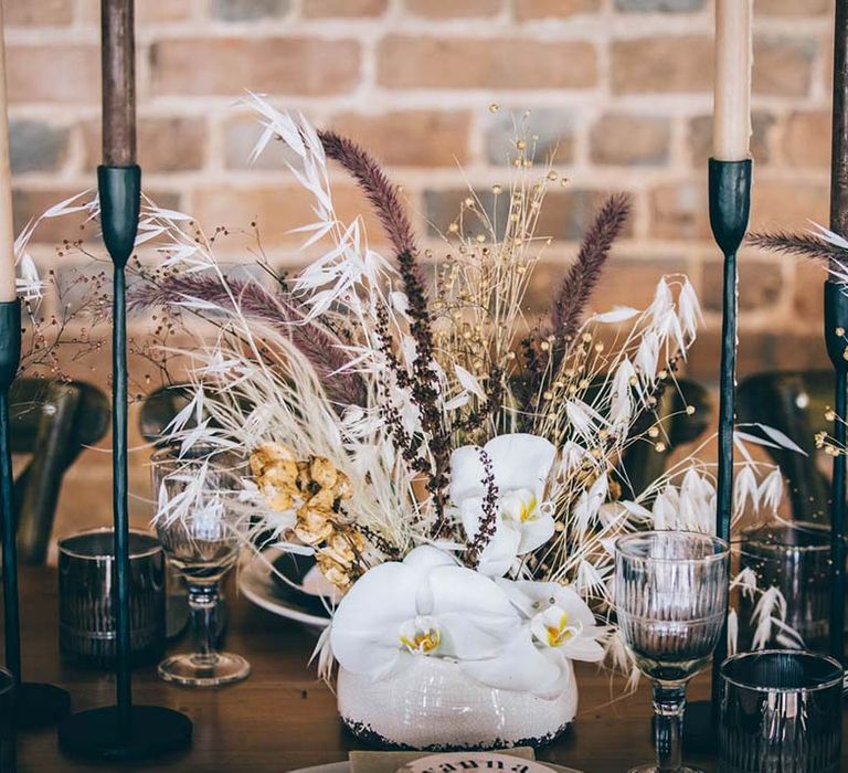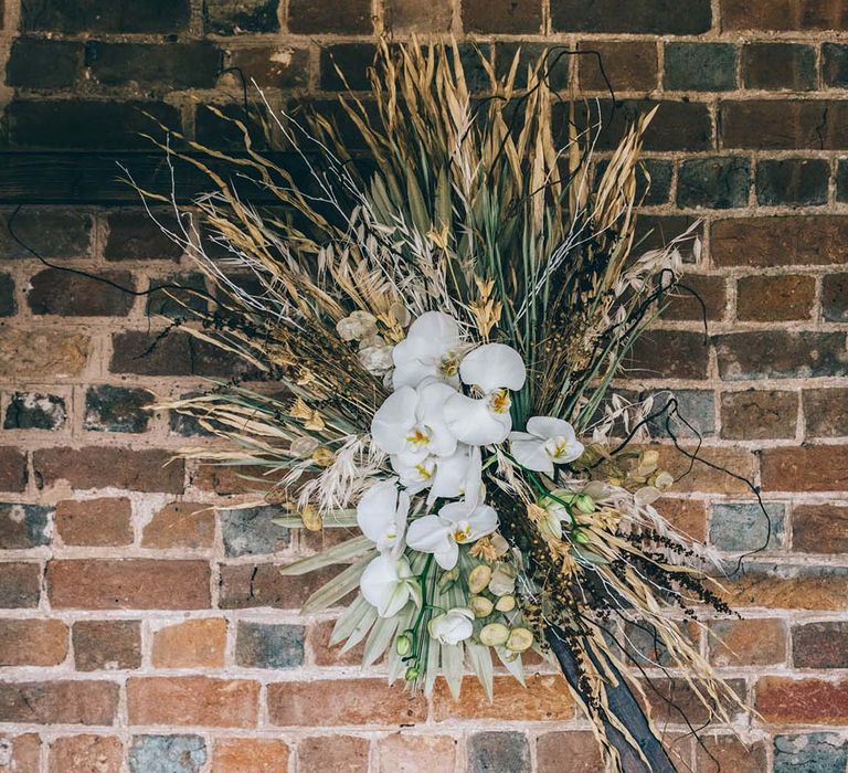 Orchids, luxury origami-inspired stationery, an intricate cake design and streamlined silhouettes paired with rattan and dried flowers completed the boho black tie inspiration.