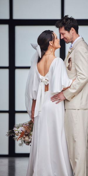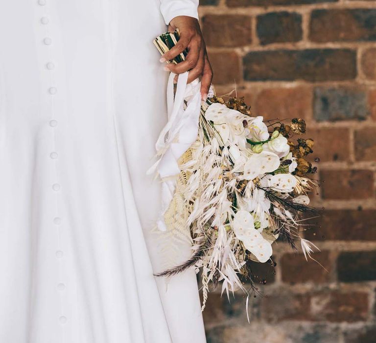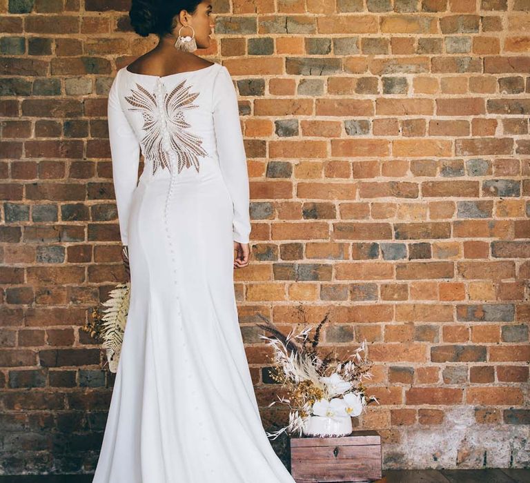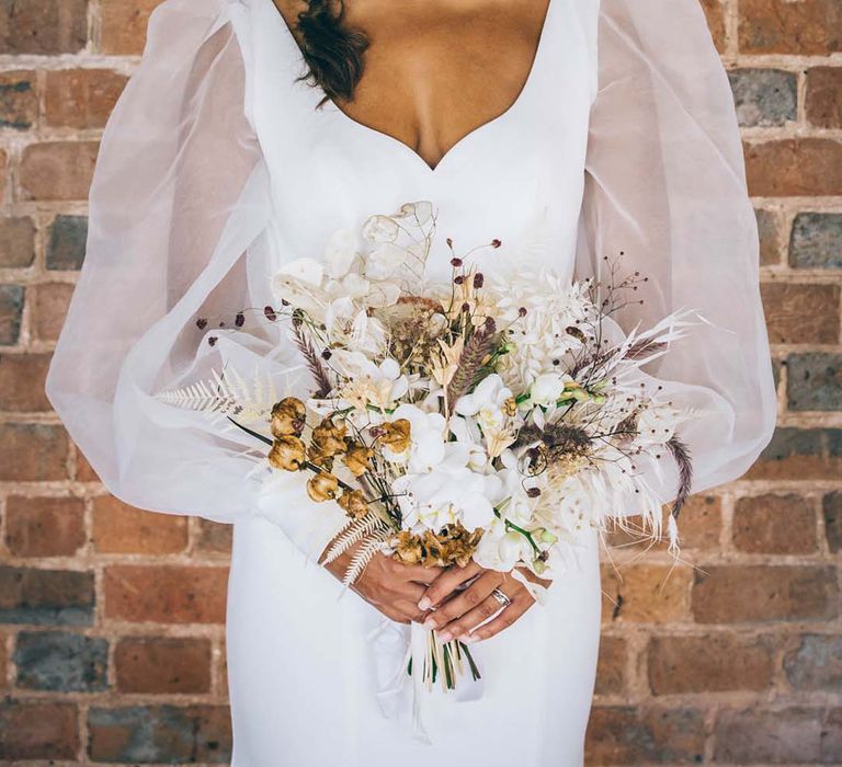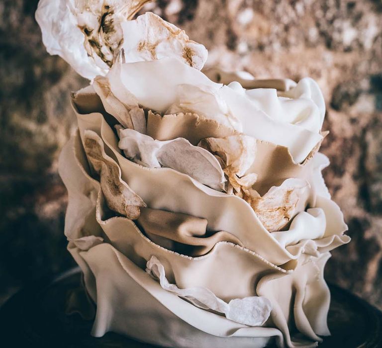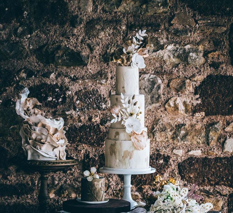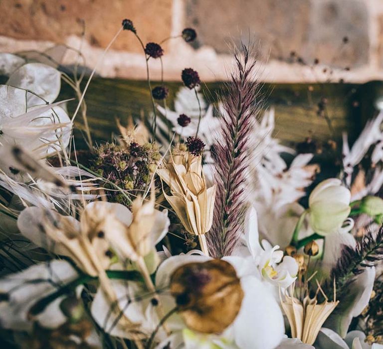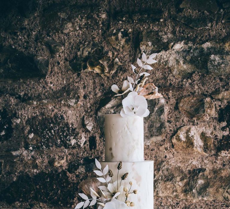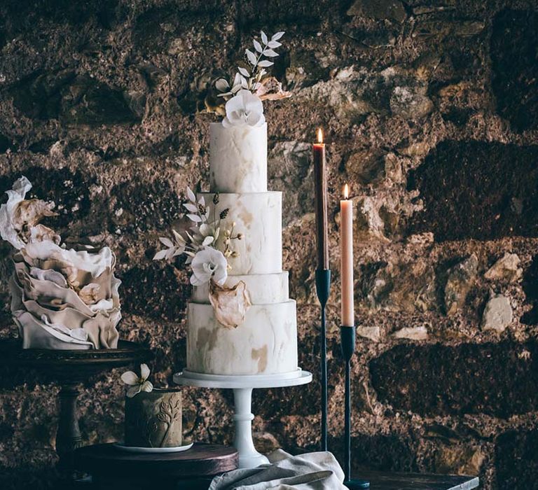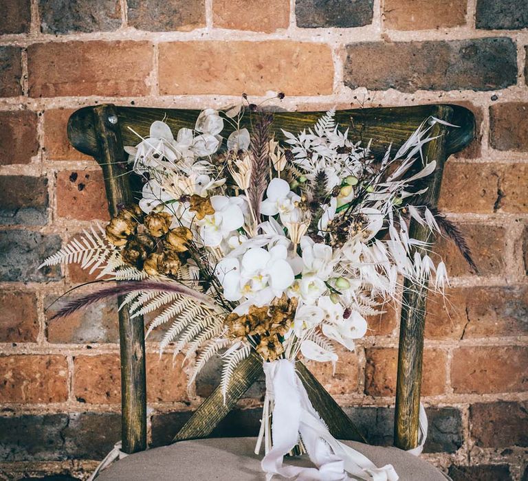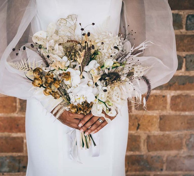 Orchids, luxury origami-inspired stationery, an intricate cake design and streamlined silhouettes paired with rattan and dried flowers completed the boho black tie inspiration.