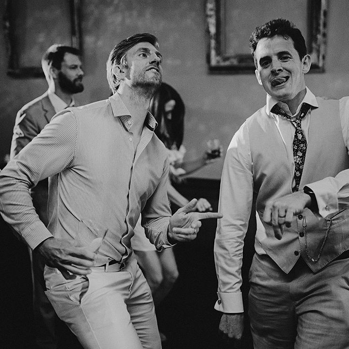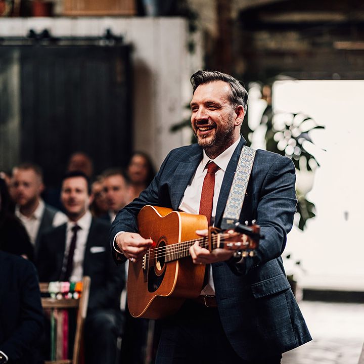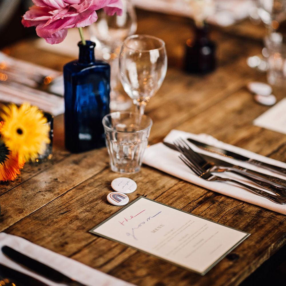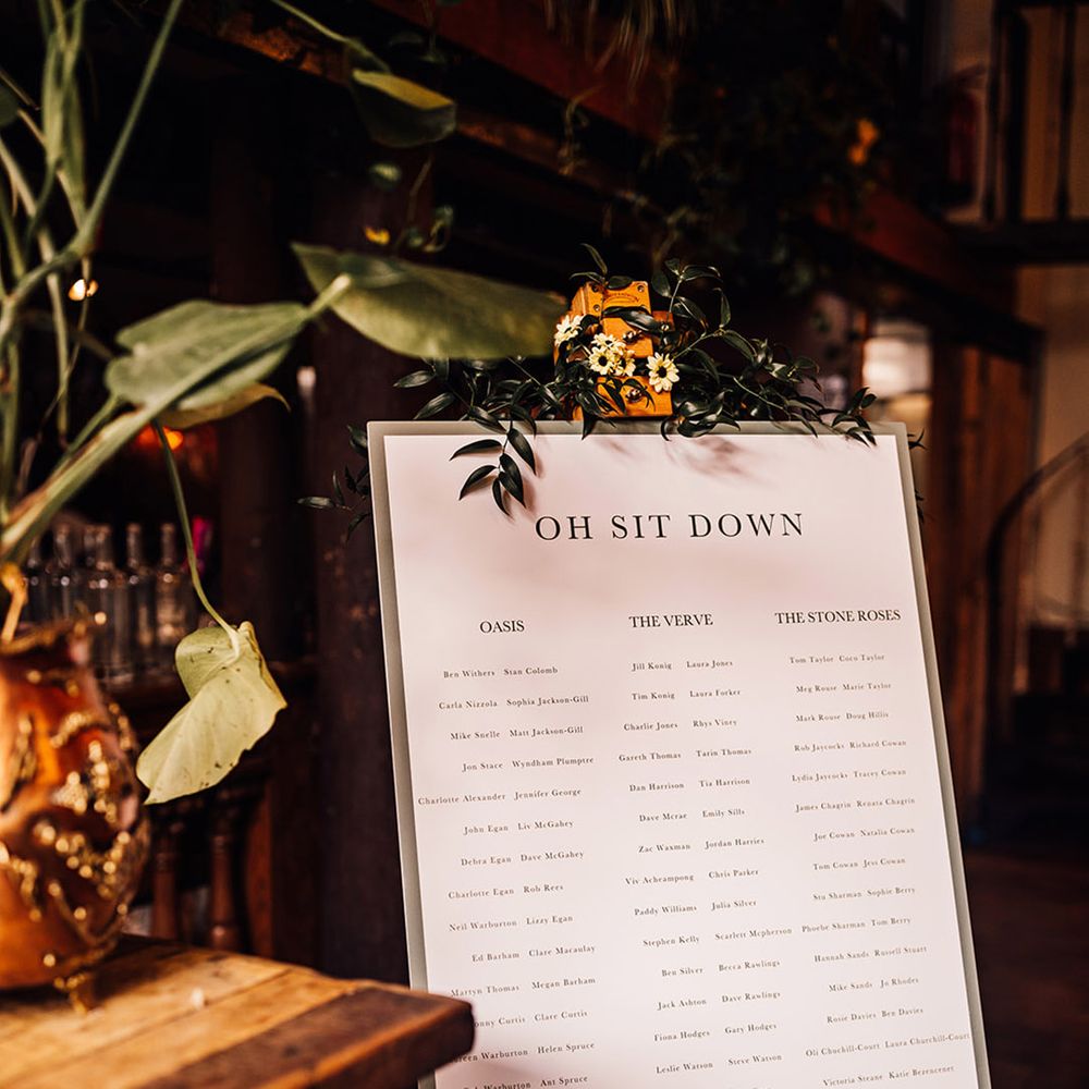 A massive shout-out to the musicians on the day. We had Solas String - an incredible trio quartet playing music at our drinks reception. Soul Factor, our band, STOLE THE SHOW as they performed in the evening - the garage remix was insane and a highlight for us! We didn't have enough time to create a photo wall, so we visited charity shops the week before the wedding and collected a bunch of frames that we popped family photos in and displayed inside the ceremony room. Our amazing artist friend Alma Singer designed all the signage on the day, table favours (badges), and names on the menus.
