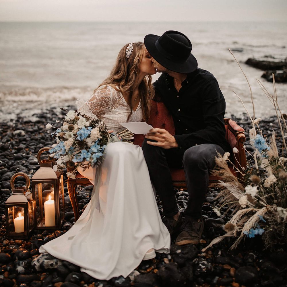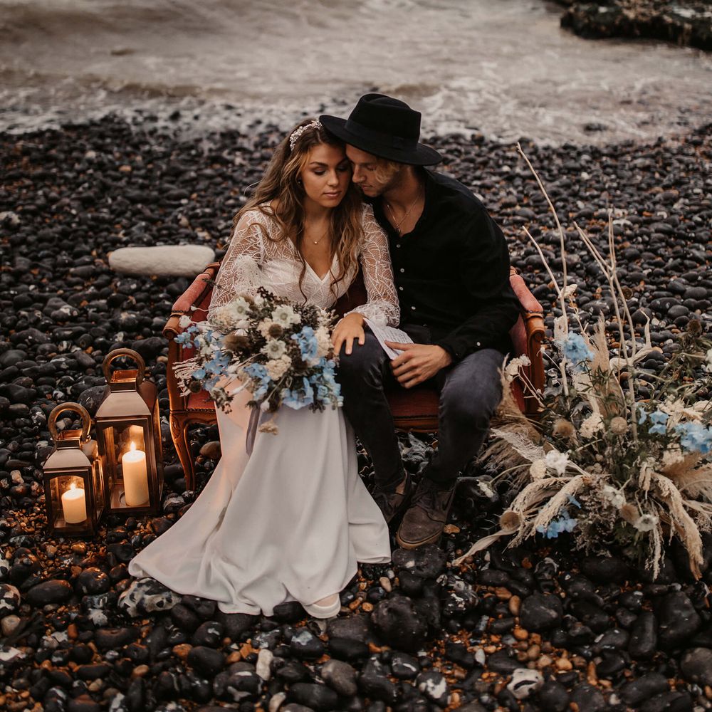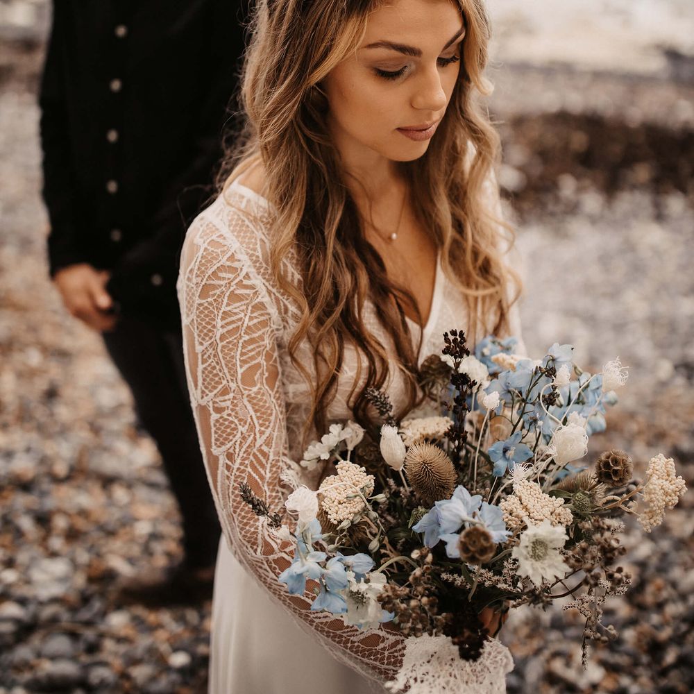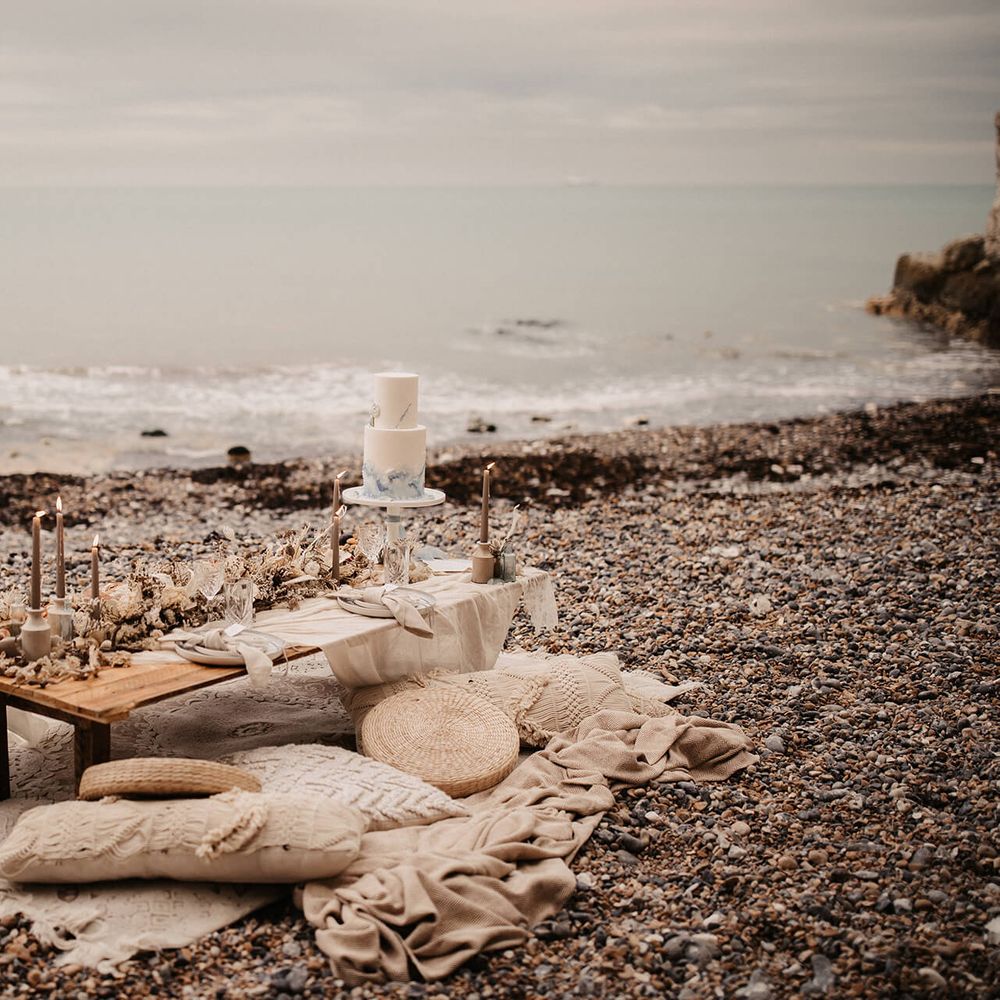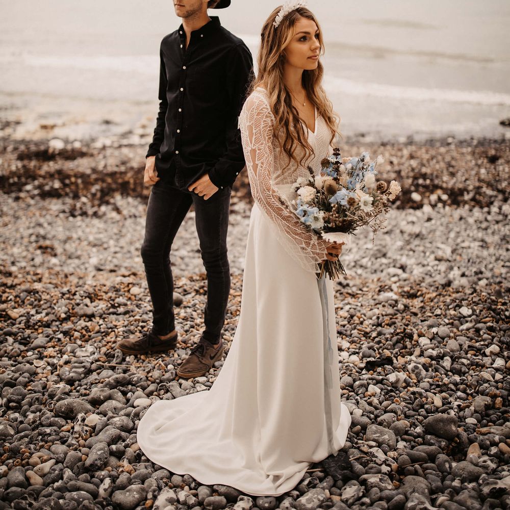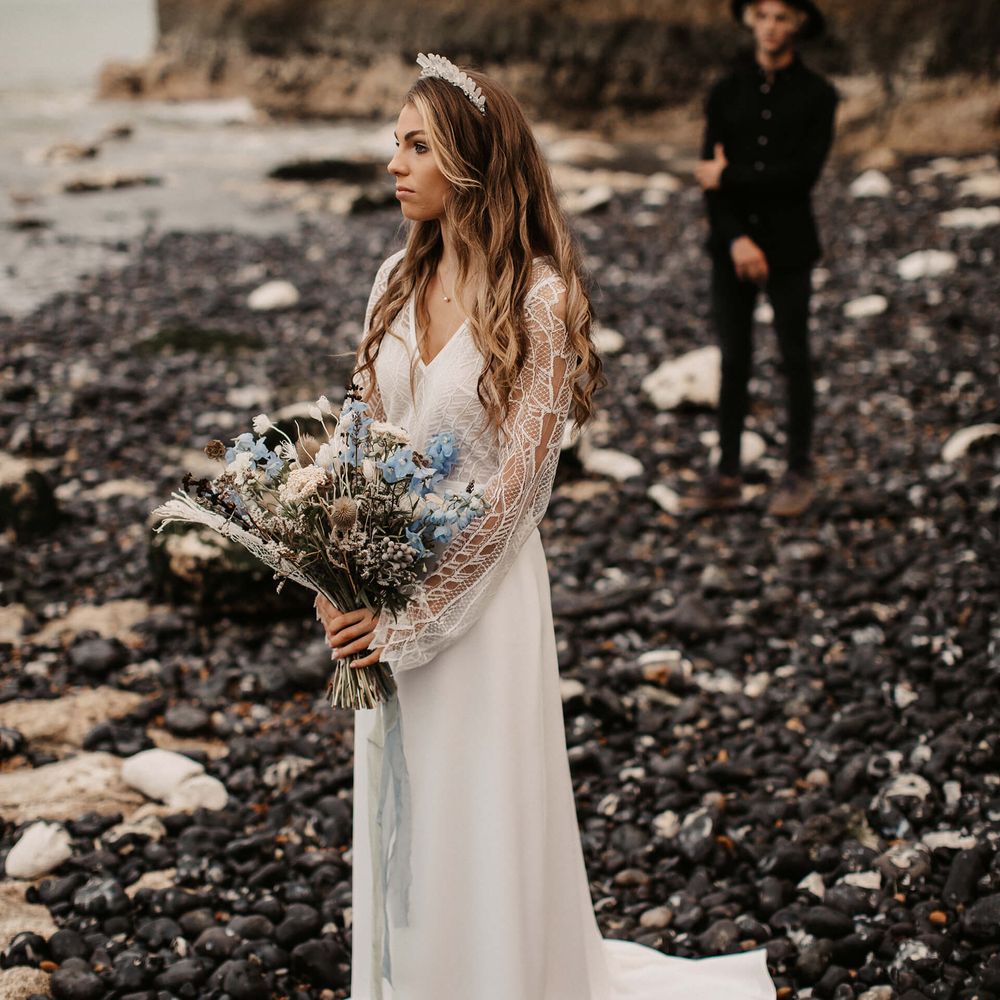 We chose to set up the coastal elopement at St. Margaret’s Bay in Kent with the famous white cliffs backdrop and the beach scattered with dark grey pebbles almost black when washed by the sea. The beach itself gives you all the feels, hence the styling of the shoot was minimal with natural elements from the coastline. Soft blue and natural grey shades went into gorgeous flower arrangements, table linen, table name cards and the beautifully handcrafted small wedding cake.