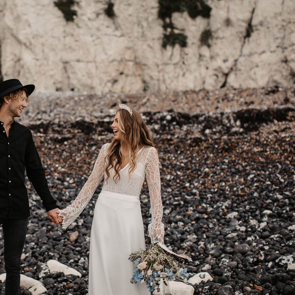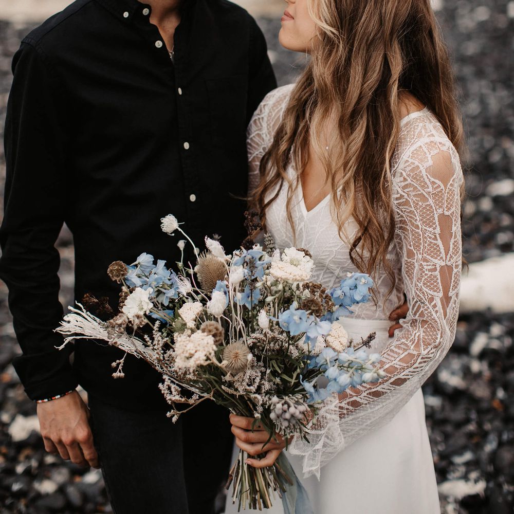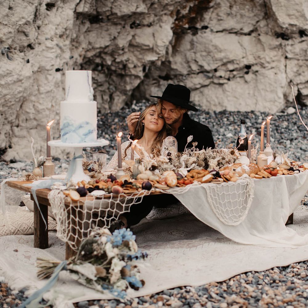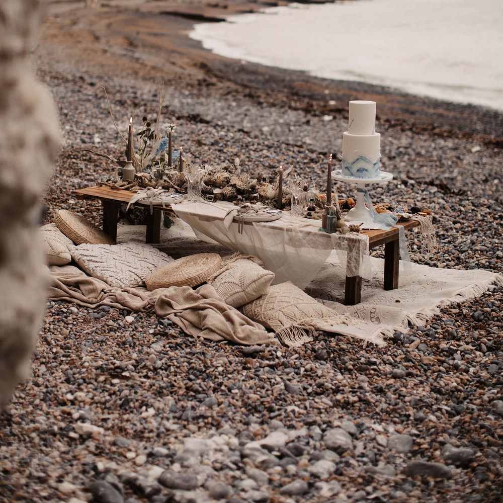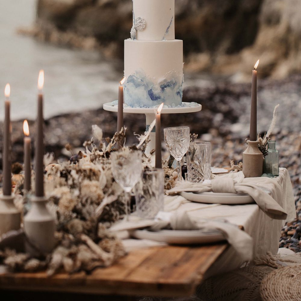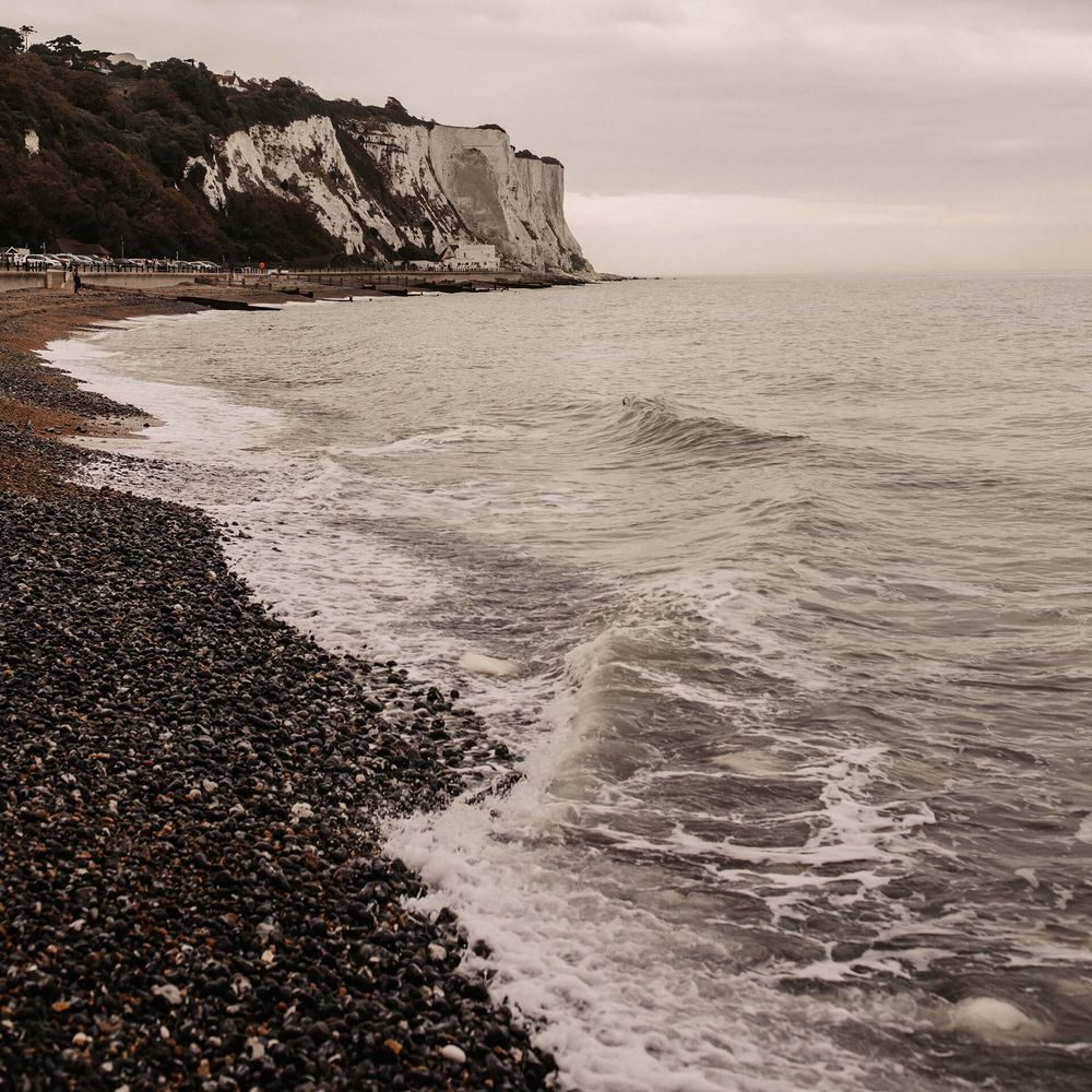 We chose to set up the coastal elopement at St. Margaret’s Bay in Kent with the famous white cliffs backdrop and the beach scattered with dark grey pebbles almost black when washed by the sea. The beach itself gives you all the feels, hence the styling of the shoot was minimal with natural elements from the coastline. Soft blue and natural grey shades went into gorgeous flower arrangements, table linen, table name cards and the beautifully handcrafted small wedding cake.