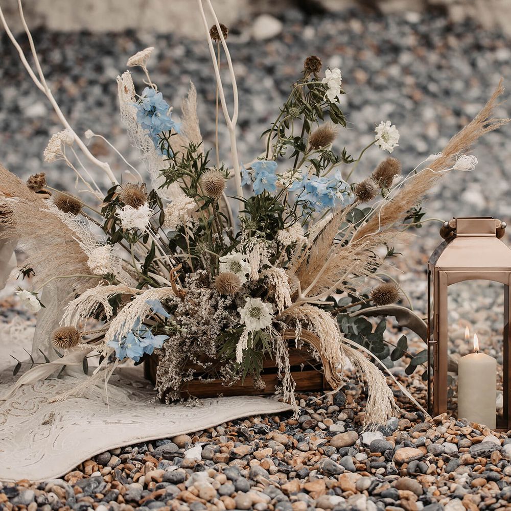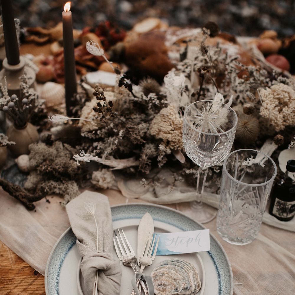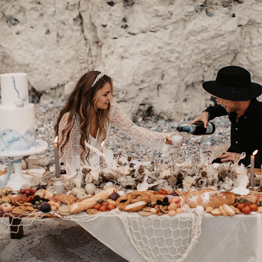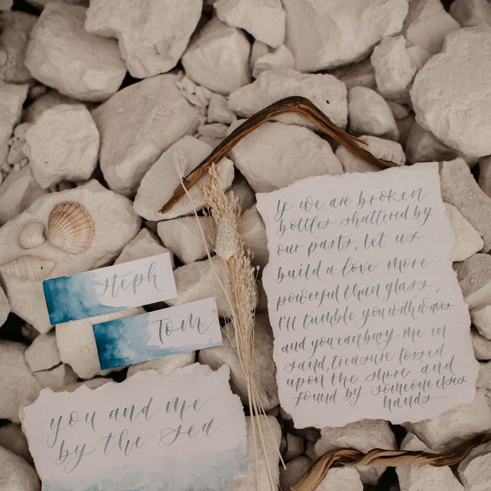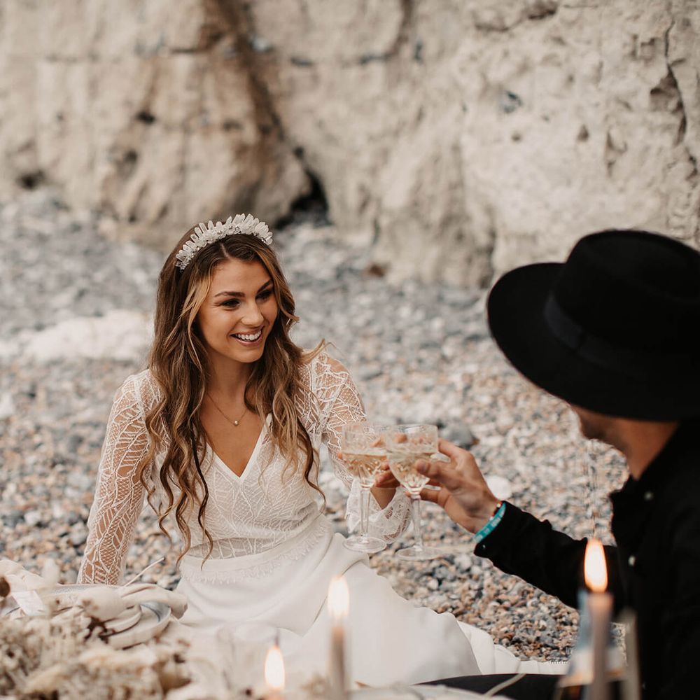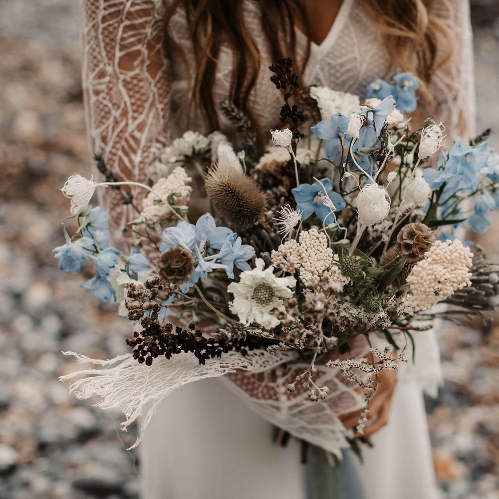 We chose to set up the coastal elopement at St. Margaret’s Bay in Kent with the famous white cliffs backdrop and the beach scattered with dark grey pebbles almost black when washed by the sea. The beach itself gives you all the feels, hence the styling of the shoot was minimal with natural elements from the coastline. Soft blue and natural grey shades went into gorgeous flower arrangements, table linen, table name cards and the beautifully handcrafted small wedding cake.