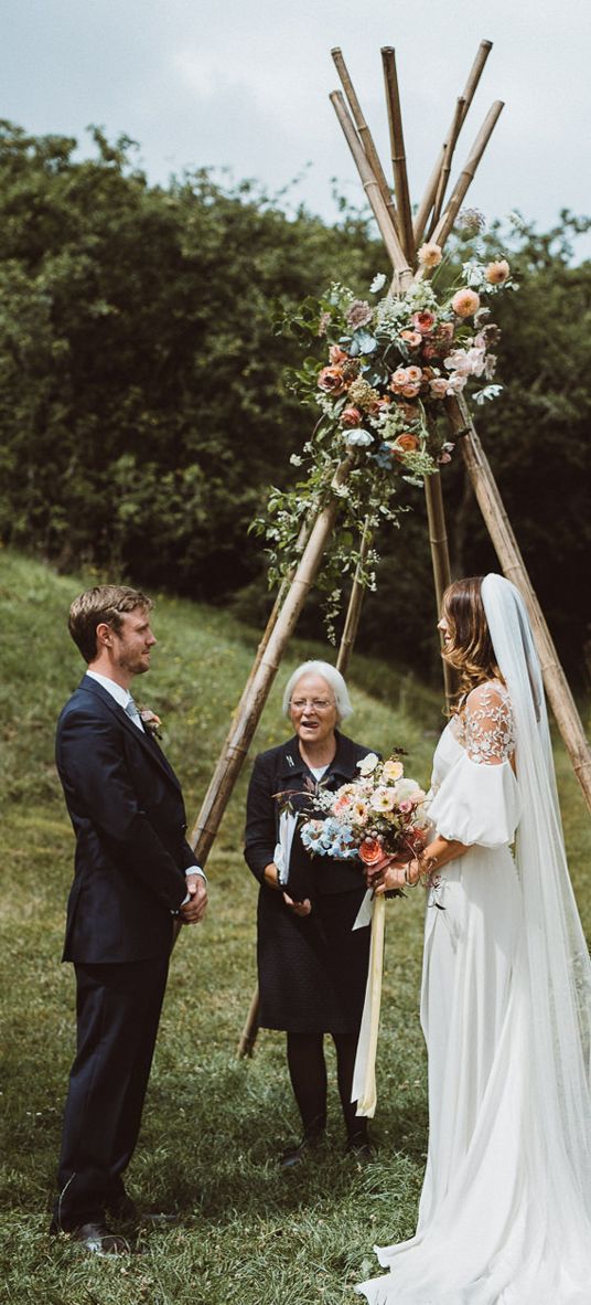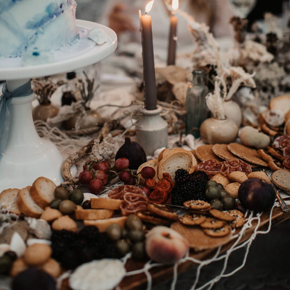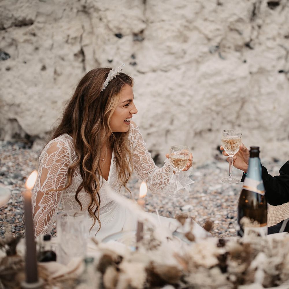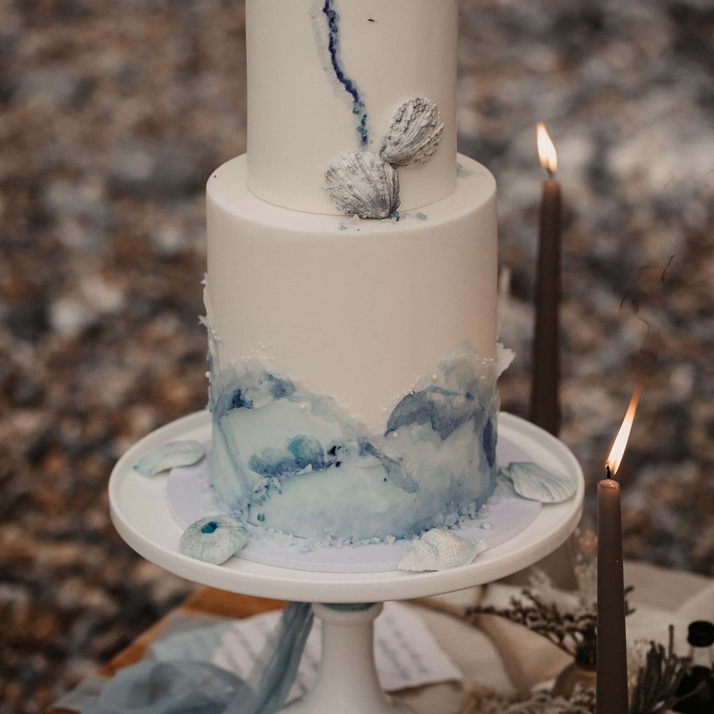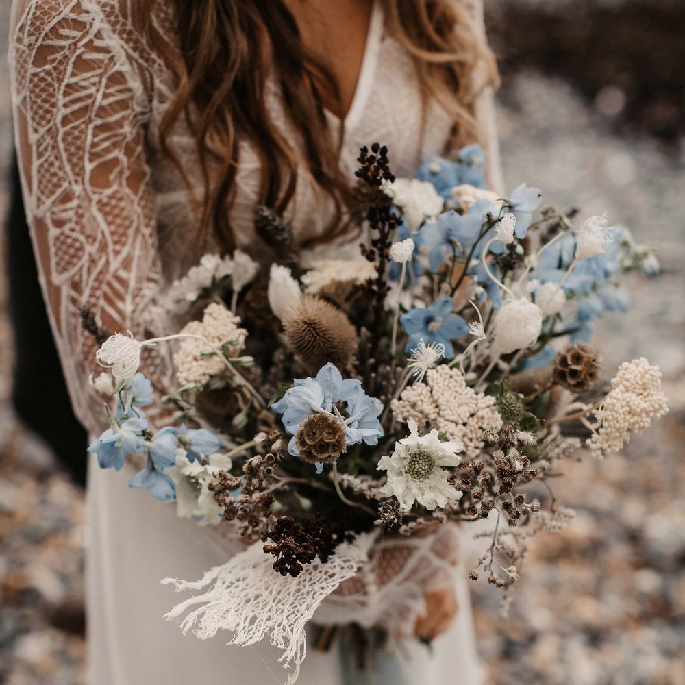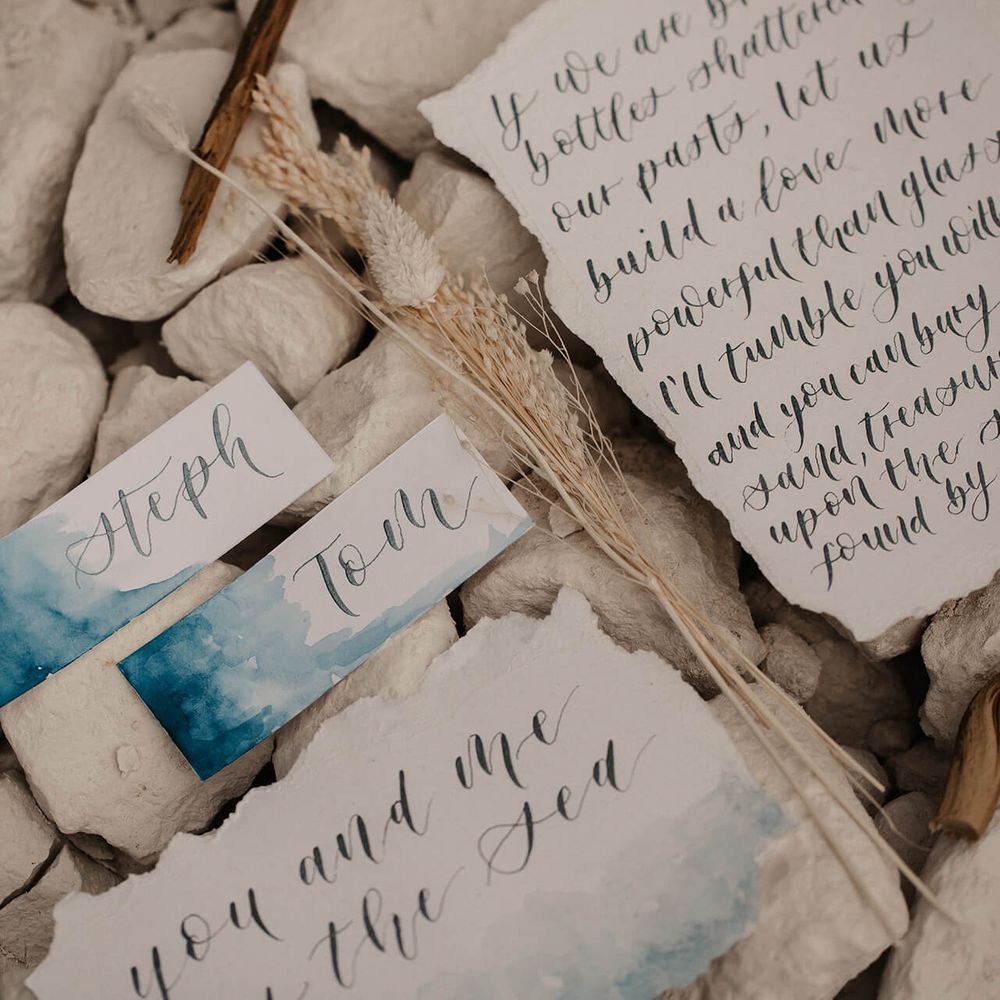 We chose to set up the coastal elopement at St. Margaret’s Bay in Kent with the famous white cliffs backdrop and the beach scattered with dark grey pebbles almost black when washed by the sea. The beach itself gives you all the feels, hence the styling of the shoot was minimal with natural elements from the coastline. Soft blue and natural grey shades went into gorgeous flower arrangements, table linen, table name cards and the beautifully handcrafted small wedding cake.