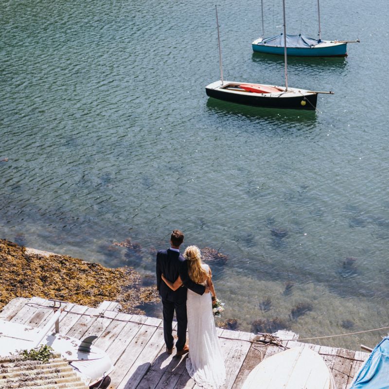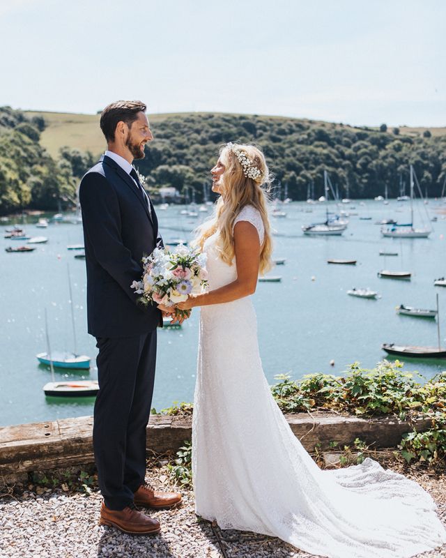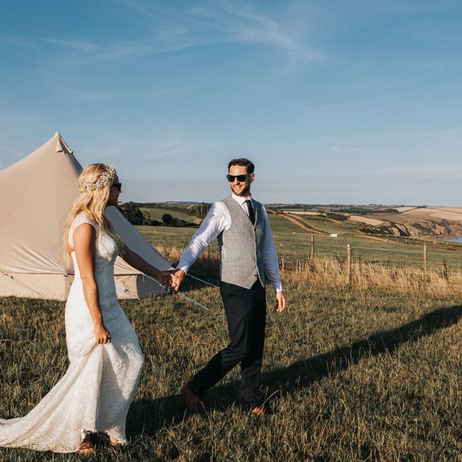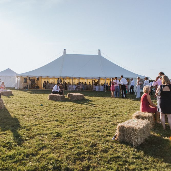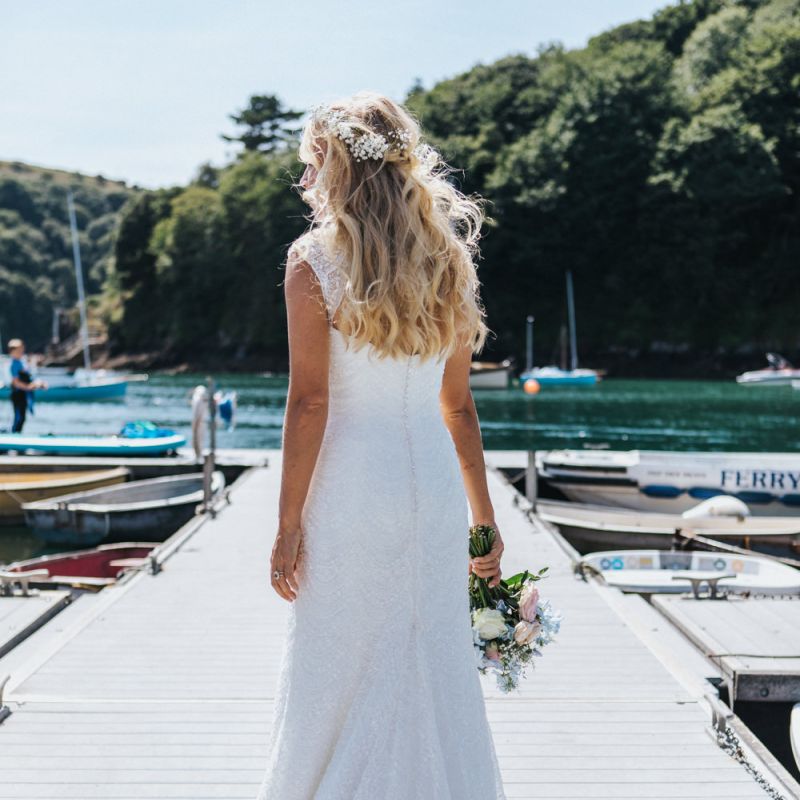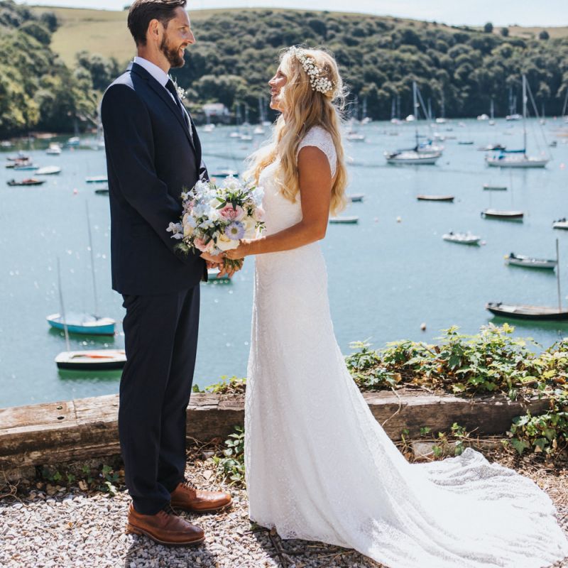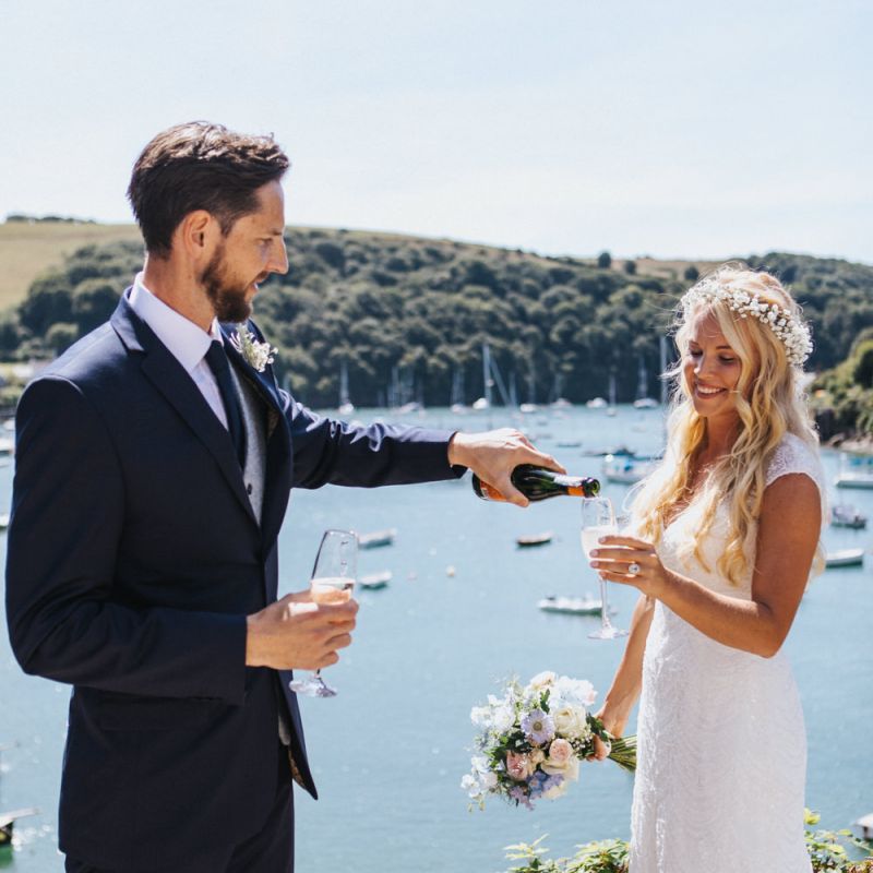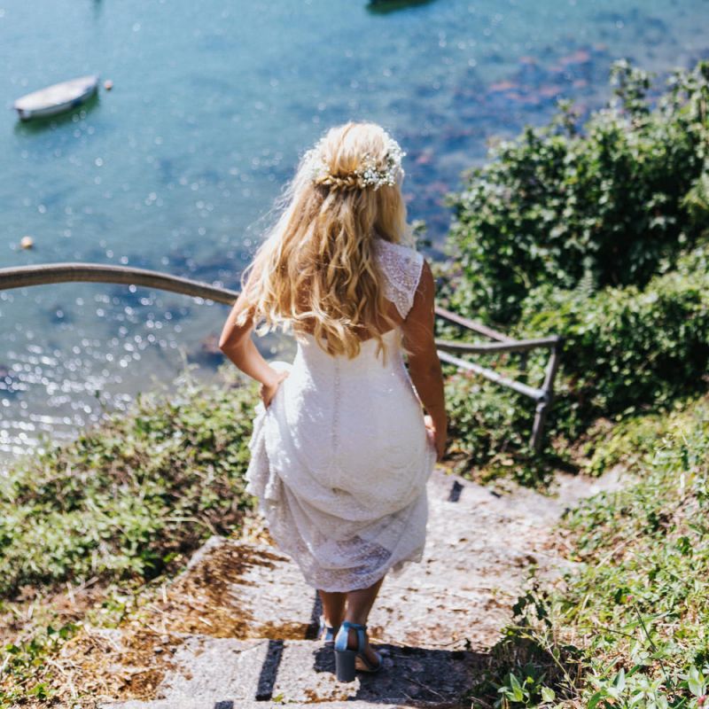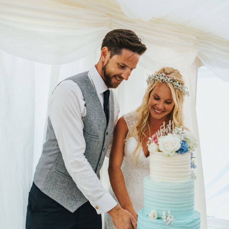Having got engaged (with the most incredible aquamarine ring!) on the tidal beach at Kynance Cove we wanted to keep a coastal theme throughout our day. We decided on having a relaxed marquee wedding overlooking the sea. The bridesmaid's dresses, wedding cake and even my shoes were sea blue! Our table names were all beaches from around the world that we had travelled to together and welcome drinks were served from a boat. Lots of our family and friends camped in the wedding field that night and as we didn't want to miss out on the fun, the bridal suite was a bell tent closest to the sea.