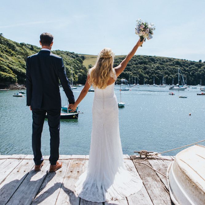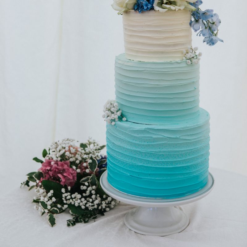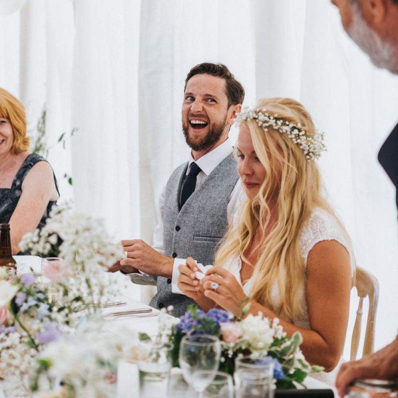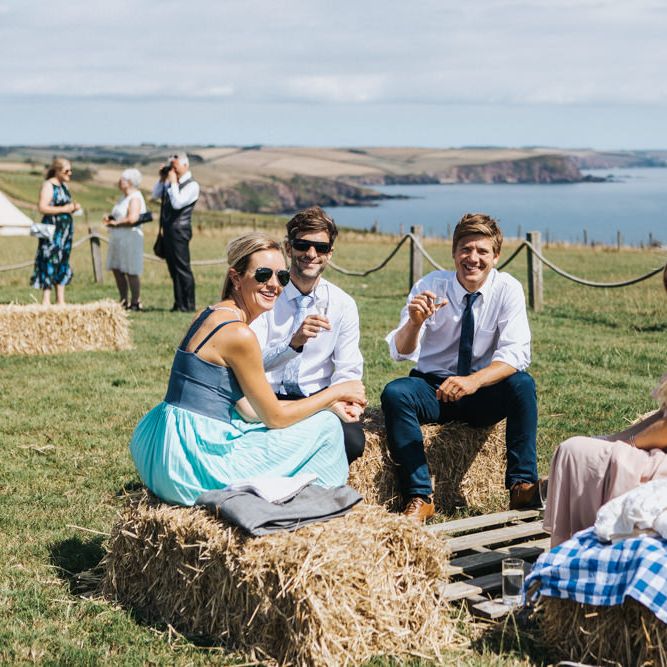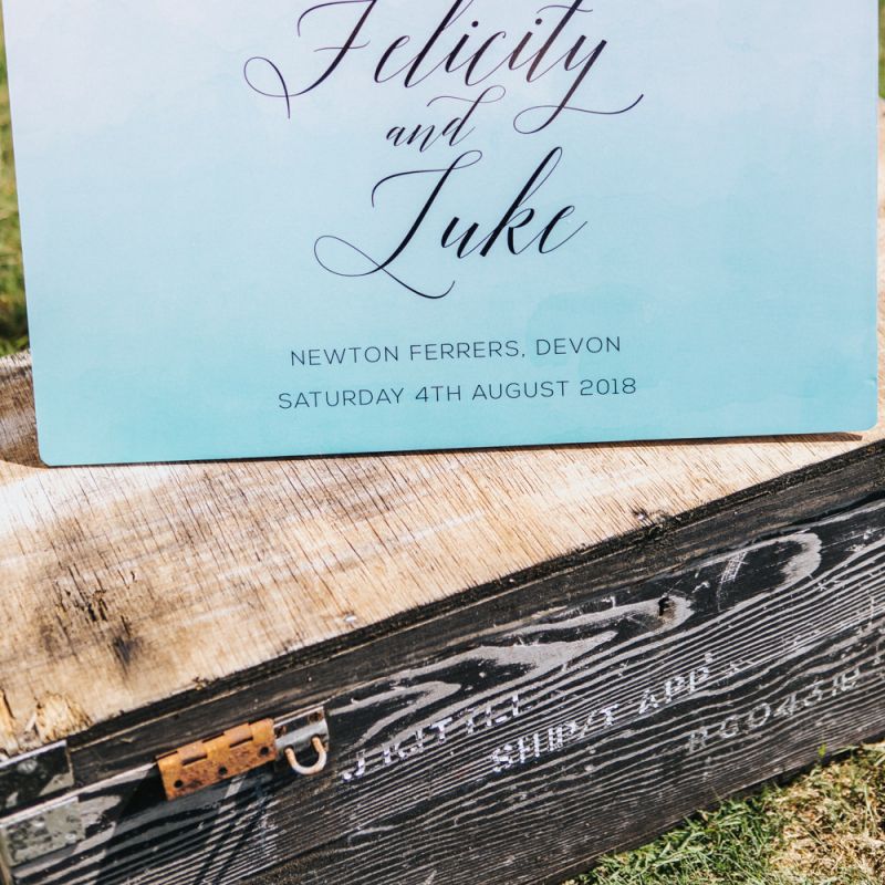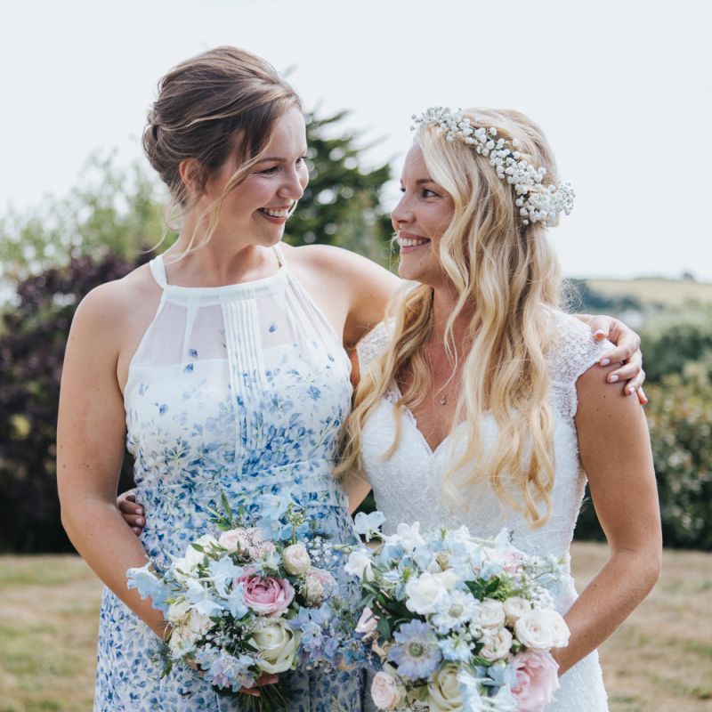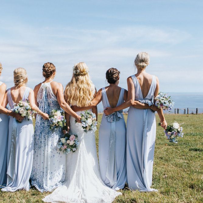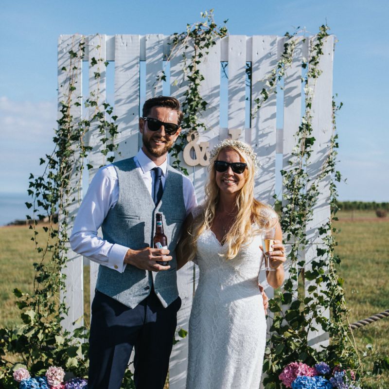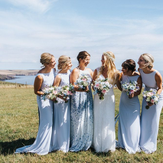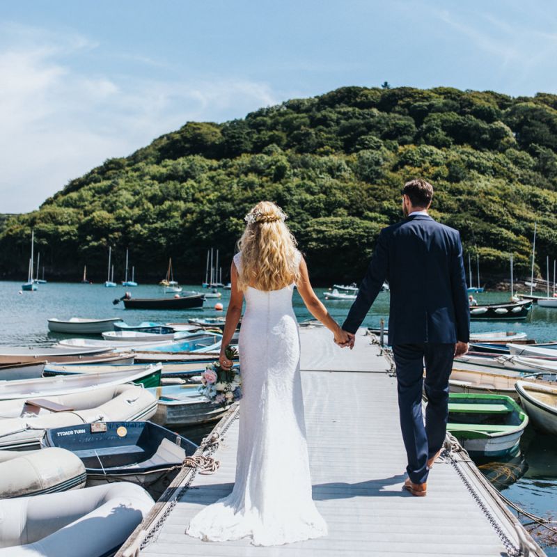 Having got engaged (with the most incredible aquamarine ring!) on the tidal beach at Kynance Cove we wanted to keep a coastal theme throughout our day. We decided on having a relaxed marquee wedding overlooking the sea. The bridesmaid's dresses, wedding cake and even my shoes were sea blue! Our table names were all beaches from around the world that we had travelled to together and welcome drinks were served from a boat. Lots of our family and friends camped in the wedding field that night and as we didn't want to miss out on the fun, the bridal suite was a bell tent closest to the sea.