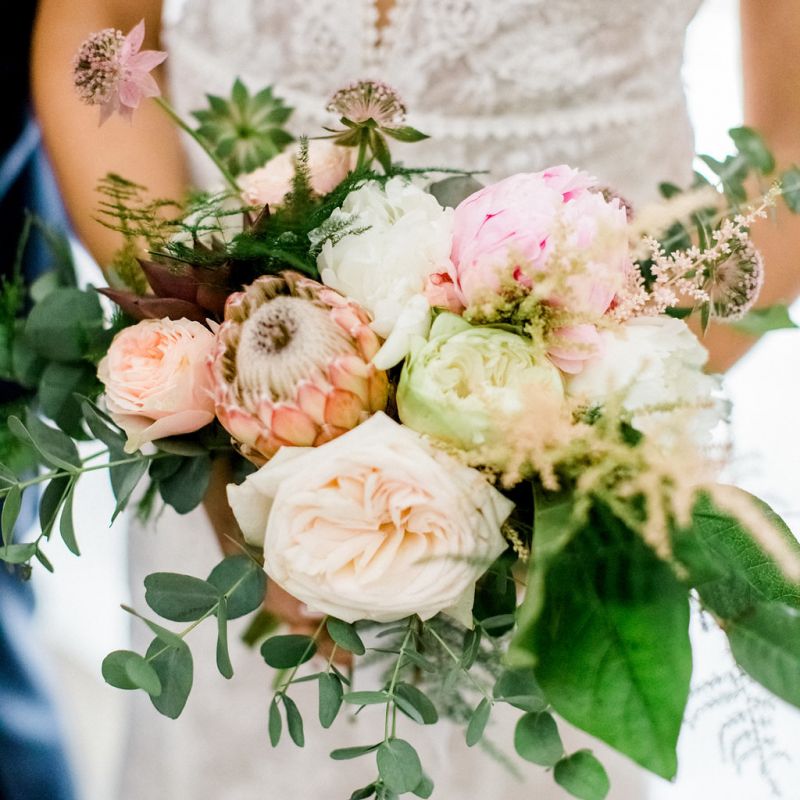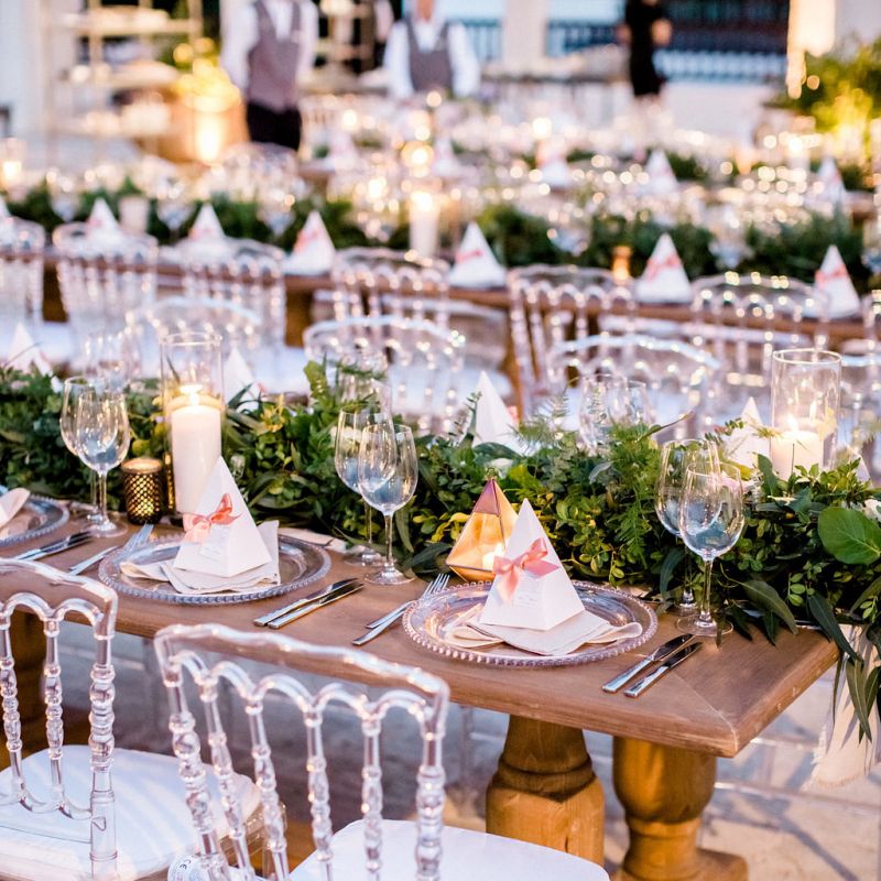 I wanted an elegant, romantic and modern theme with sentimental elements. I chose to work with rose gold colours, candles and fairy lights to offer softness and modern geometric shapes in the decor and wedding favours. I requested the flowers pink Protea to link South Africa to the wedding theme and roses to link our favourite song (also first dance song) La vie en rose. We also wanted everyone to enjoy modern music in a classical way so we had a flute and strings quartet band play a list of our favourite modern songs.